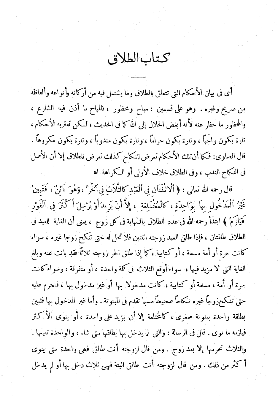 أي في بيان الأحكام التي تتعلق بالطلاق وما يشتمل فيه من أركانه وأنواعه وألفاظه من صريح وغيره. وهو على قسمين: مباح ومحظور، فالمباح ما أذن فيه الشارع، والمحظور ما حظر عنه لأنه أبغض الحلال إلى الله كما في الحديث، لكن تعتريه الأحكام، تارة يكون واجباً، وتارة يكون حراماً، وتارة يكون مندوباً، وتارة يكون مكروهاً. قال الصاوي: فكما أن تلك الأحكام تعرض للنكاح كذلك تعرض للطلاق إلا أن الأصل في النكاح الندب، وفي الطلاق خلاف الأولى أو الكراهة اهـ.