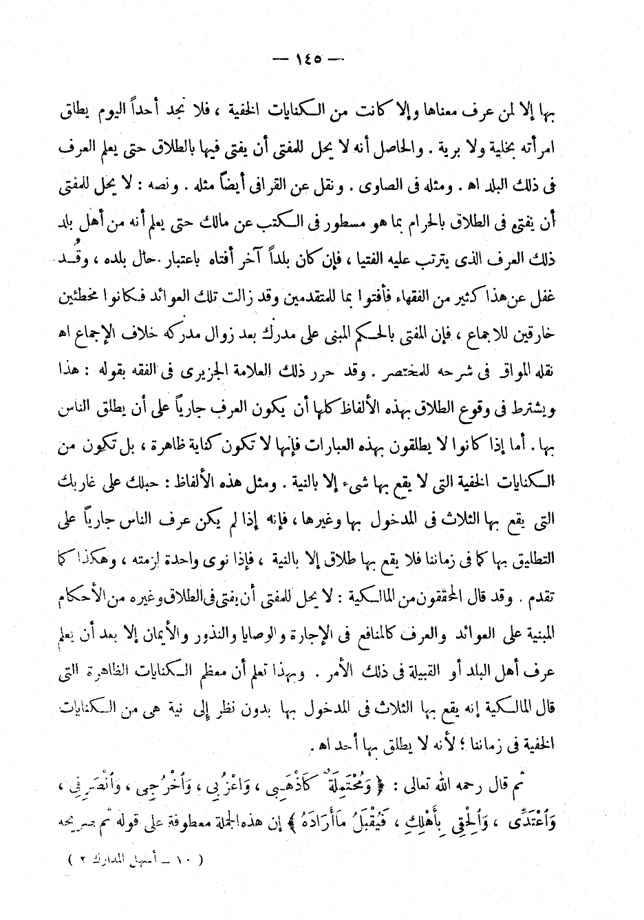 بها إلا لمن عرف معناها وإلا كانت من الكنايات الخفية، فلا نجد أحداً اليوم يطلق امرأته بخلية ولا برية. والحاصل أنه لا يحل للمفتي أن يفتي فيها بالطلاق حتى يعلم العرف في ذلك البلد اهـ. ومثله في الصاوي. ونقل عن القوافي أيضاً مثله. ونصه: لا يحل للمفتي أن يفتي في الطلاق بالحرام بما هو مسطور في الكتب عن مالك حتى يعلم أنه من أهل بلد ذلك العرف الذي يترتب عليه الفتيا، فإن كان بلداً آخر أفتاه باعتبار حال بلده، وقد غفل عن هذا كثير من الفقهاء فأفتوا بما للمتقدمين وقد زالت تلك العوائد فكانوا مخطئين خارقين للإجماع، فإن المفتي بالحكم المبني على مدرك بعد زوال مدركه خلاف الإجماع اهـ نقله المواق في شرحه للمختصر. وقد حرر ذلك العلامة الجزيري في الفقه بقوله: هذا ويشترط في وقوع الطلاق بهذه الألفاظ كلها أن يكون العرف جارياً على أن يطلق الناس بها. أما إذا كانوا لا يطلقون بهذه العبارات فإنها لا تكون كناية ظاهرة، بل تكون من الكنايات الخفية التي لا يقع بها إلا بالنية. ومثل هذه الألفاظ: حبلك على غاربك التي يقع بها الثلاث في المدخول بها وغيرها، فإنه إذا لم يكن عرف الناس جارياً على التطليق بها كما في زمننا فلا يقع بها طلاق إلا بالنية، فإذا نوى واحدة لزمته، وهكذا كما تقدم. وقد قال المحققون من المالكية: لا يحل للمفتي أن يفتي في الطلاق وغيره من الأحكام المبنية على العوائد والعرف كالمنافع في الإجارة والوصايا والنذور والأيمان إلا بعد أن يعلم عرف أهل البلد أو القبيلة في ذلك الأمر. وبهذا تعلم أن معظم الكنايات الظاهرة التي قال المالكية إنه يقع بها الثلاث في المدخول بها بدون نظر إلى نية هي من الكنايات الخفية في زمننا، لأنه لا يطلق بها أحد اهـ.