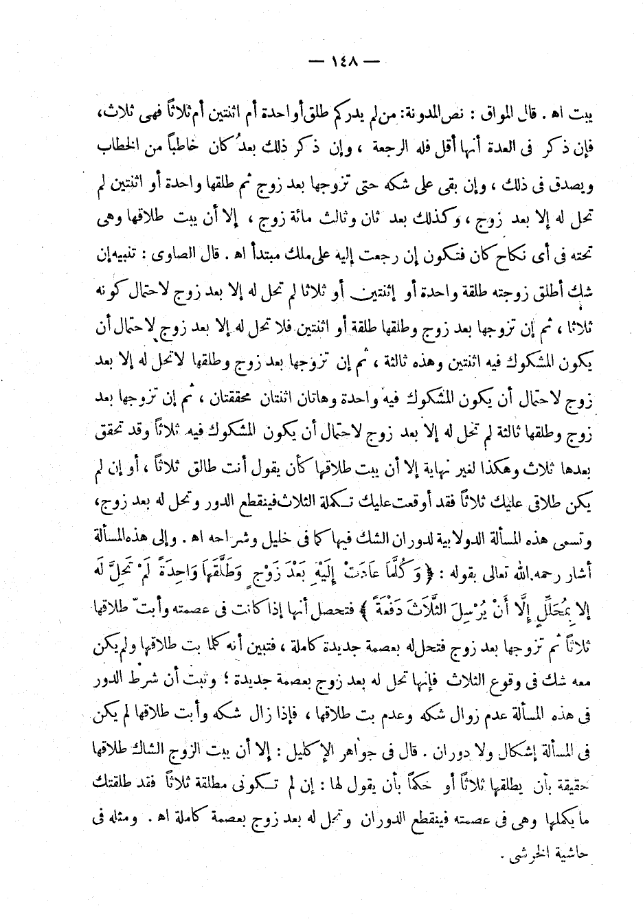 يبت اهـ. قال المواق: نص المدونة: من لم يدر كم طلق أواحدة أم أثنتين أم ثلاثاً فهي ثلاث، فإن ذكر في العدة أنها أقل فله الرجعة، وإن ذكر ذلك بعد كان خاطباً من الخطاب ويصدق في ذلك، وإن بقي على شكه حتى تزوجها بعد زوج ثم طلقها واحدة أو أثنتين لم تحل له إلا بعد زوج، وكذلك بعد ثان وثالث مائة زوج، إلا أن يبت طلاقها وهي تحته في أي نكاح كان فتكون إن رجعت إليه على ملك مبتدأ اهـ. قال الصاوي: تنبيه إن شك أطلق زوجته طلقة طلقة واحدة أو أثنتين أو ثلاثاً لم تحل له إلا بعد زوج لاحتمال كونه ثلاثاً، ثم إن تزوجها بعد زوج وطلقها طلقة أو اثنتين فلا تحل له إلا بعد زوج لاحتمال أن يكون المشكوك فيه اثنتين وهذه ثالثة، ثم إن تزوجها بعد زوج وطلقها لا تحل له إلا بعد زوج لاحتمال أن يكون المشكوك فيه واحدة وهاتان اثنتان محققتان، ثم إن تزوجها بعد زوج وطلقها ثالثة لم تحل له إلا بعد زوج لاحتمال أن يكون المشكوك فيه ثلاثاً وقد تحقق بعدها ثلاث وهكذا لغير نهاية إلا أن يبت طلاقها كأن يقول أنت طالق ثلاثاً، أو إن لم يكن طلاقي عليك ثلاثاً فقد أوقعت عليك تكملة الثلاث فينقطع الدور وتحل له بعد زوج، وتسمى هذه المسألة الدولابية لدوران الشك فيها كما في خليل وشراحه اهـ. وإلى هذه المسألة أشار رحمه الله تعالى بقوله: " وكلما عادت إليه بعد زوج وطلقها واحدة لم تحل له إلا بمحلل إلا أن يرسل الثلاث دفعة " فتحصل أنها إذا كانت في عصمته وأبت طلاقها ثلاثاً ثم تزوجها بعد زوج فتحل له بعصمة جديدة كاملة، فتبين أنه كلما بت طلاقها، ولم يكن معه شك في وقوع الثلاث فإنها تحل له بعد زوج بعصمة جديدة، وثبت أن شروط الدور في هذه المسألة عدم زوال شكه وعدم بت طلاقها، فإذا زال شكه وأبت طلاقها لم يكن في المسألة إشكال ولا دوران. قال في جواهر الإكليل: إلا أن يبت الزوج الشاك طلاقها حقيقة بأن يطلقها ثلاثاً أو حكماً بأن