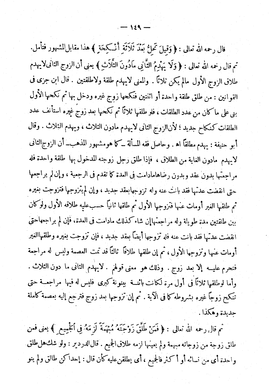 قال رحمه الله تعالى: " وقيل تحل بعد ثلاثة أنكحة " هذا مقابل المشهور فتأمل. ثم قال رحمه الله تعالى: " ولا يهدم الثاني ما دون الثلاث " يعني أن الزوج الثاني لا يهدم طلاق الزوج الأول ما لم يكن ثلاثاً. والمعنى لا يهدم طلقة ولا طلقتين. قال ابن جزي في القوانين: من طلق طلقة واحدة أو اثنتين فنكحها زوج غيره ودخل بها ثم نكحها الأول بني على ما كان من عدد الطلقات، فلو طلقها ثلاثاً ثم نكحها بعد زوج غيره استأنف عدد الطلقات كنكاح جديد، لأن الزوج الثاني لا يهدم ما دون الثلاث، ويهدم الثلاث. وقال أبو حنيفة: يهدم مطلقاً اهـ. وحاصل فقه المسألة ـ كما هو مشهور المذهب - أن الزوج الثاني لا يهدم ما دون الغاية من الطلاق، فإذا طلق رجل زوجته المدخول بها طلقة واحدة فله مراجعتها بدون عقد وبدون رضاها ما دامت في العدة كما تقدم في الرجعية، وإن لم يراجعها حتى انقضت عدتها فقد بانت عنه وله تزوجها بعقد جديد، وإن لم يتزوجها فتزوجت بغيره ثم طلقها الغير أو مات عنها فتزوجها الأول ثم طلقها ثانياً حسب عليه طلاقه الأول ولو كان بين طلقتين مدة طويلة وله مراجعتها إن شاء كذلك ما دامت في العدة، فإن لم يراجعها حتى انقضت عدتها فقد بانت عنه فله تزوجها أيضاً بعقد جديد، فإن تزوجت بغيره وطلقها الغير أو مات عنها وتزوجها الأول، ثم إن طلقها طلاقاً ثالثاً قد تمت العصمة وليس له مراجعة فتحرم عليه إلا بعد زوج. وذلك هو معنى قولهم. لا يهدم الثاني ما دون الثلاث. وأما لو طلقها ثلاثاً في أول مرة لكانت بائنة بينونة كبرى فليس له فيها مراجعة حتى تنكح زوجاً غيره بشروطه كما في الآية. ثم إن تزوجها بعد زوج فترجع إليه بعصمة كاملة جديدة وهكذا.