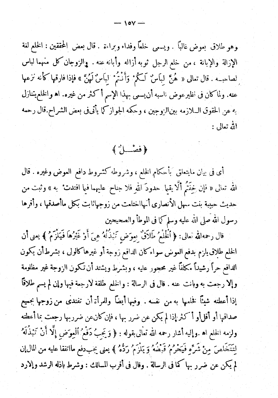 أي في بيان ما يتعلق بأحكام الخلع، وشروطه كشروط دافع العوض وغيره. قال الله تعالى: {فإن خفتم ألا يقيما حدود الله فلا جناح عليهما فيما افتدت} {البقرة: 229} وثبت من حديث حبيبة بنت سهل الأنصاري أنها اختلعت من زوجها ثابت بكل ما أصدقها، وأقرها رسول الله صلى الله عليه وسلم كما في الموطأ والصحيحين.