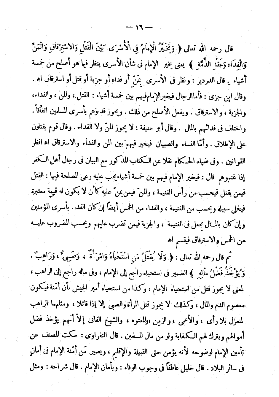 ثم قال رحمه الله تعالى: " ولا يقتل من استحياه وامرأة، وصبي، وراهب ويؤخذ فضل مالك " الضمير في استحياه راجع إلى الإمام، وفى ماله راجع إلى الراهب، لمعنى لا يجوز قتل من استحياه الإمام، وكذا من استحياه أمير الجيش بأن أمنه فيكون معصوم الدم والمال، وكذلك لا يجوز قتل المرأة والصبي إلا إذا قاتلا، ومثلهما الراهب لمنعزل بلا رأى، والأعمى، والزمن، والمعتوه، والشيخ الفاني إلا أنه يؤخذ فضل أموالهم ويترك لهم الكفاية ولو من مال المسلمين. قال النفراوي: سكت المصنف عن تأمين الإمام لوضوحه لأنه يؤمن حتى القبيلة والإقليم، ويصير من أمنه الإمام في أمان في سائر البلاد. قال خليل عاطفاً في وجوب الوفاء: وبأمان الإمام. قال شراحه: ومثل