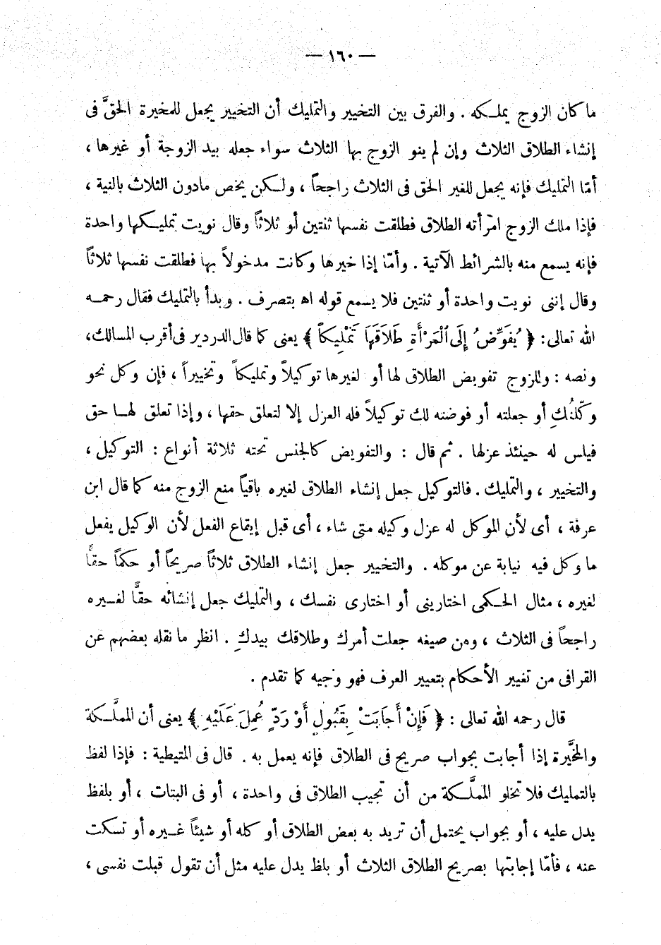 ما كان الزوج يملكه. والفرق بين التخيير والتمليك أن التخيير يجعل للمخيرة الحق في إنشاء الطلاق الثلاث وإن لم ينو الزوج بها الثلاث سواء جعله بيد الزوجة أو غيرها، أما التمليك فإنه يجعل للغير الحق في ثلاث راجحاً، ولكن يخص ما دون الثلاث بالنية، فإذا ملك الزوج امرأته الطلاق فطلقت نفسها اثنتين أو ثلاثاً وقال: نويت تمليكها واحدة فإنه يسمع منه بالشرائط الآتية. وأما إذا خيرها وكانت مدخولاً بها فطلقت نفسها ثلاثاً وقال إنني نويت واحدة أو ثنتين فلا يسمع قوله اهـ بتصرف. وبدأ بالتمليك فقال رحمه الله تعالى: " يفوض إلى المرأم طلاقها تمليكاً " يعني كما قال الدردير في أقرب المسالك، ونصه: وللزوج تفويض الطلاق لها أو لغيرها توكيلاً وتمليكاً وتخييراً، فإن وكل نحو وكلتك أو جعلته أو فوضته لك توكيلاً فله العزل إلا لتعلق حقها، وإذا تعلق لها حق فليس له حينئذ عزلها. ثم قال: والتفويض كالجنس تحته ثلاثة أنواع: التوكيل، والتخيير، والتمليك. فالتوكيل جعل إنشاء الطلاق لغيره باقياً منع الزوج منه كما قال ابن عرفة، أي لأن الموكل له عزل وكيله متى شاء، أي قبل إيقاع الفعل لأن الوكيل يفعل ما وكل فيه نيابة عن موكله. والتخيير جعل إنشاء الطلاق ثلاثاً صريحاً أو حكما حقاً لغيره، مثال الحكمي اختارني أو اختاري نفسك، والتمليك جعل إنشائه حقاً لغيره راجحاً في الثلاث، ومن صيغه جعلت أمرك وطلاقك بيدك. انظر ما نقلهبعضهم عن القرافي من تغيير الأحكام بتغيير العرف فهو وجيه كما تقدم.