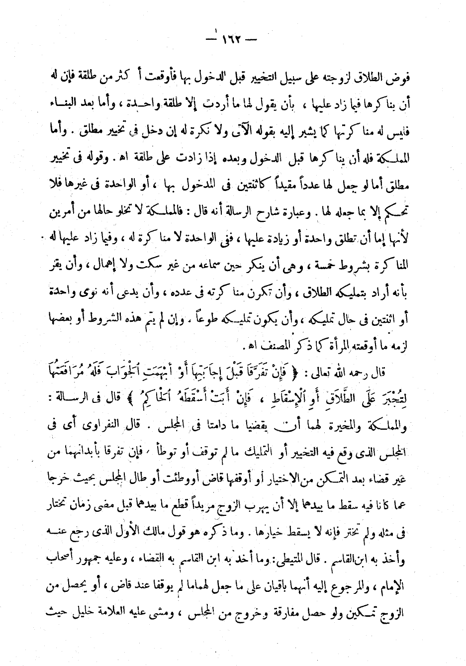 قال رحمه الله تعالى: " فإن تفرقا قبل إجابتها أو أبهمت الجواب فله مرافعتها لتجبر على الطلاق أو الإسقاط، فإن أبت أسقطه الحاكم " قال في الرسالة: والمملكة والمخيرة لهما أن يقضيا ما دامتا في المجلس. قال النفراوي أي في المجلس الذي وقع فيه التخيير أو التمليك ما لم توقف أو توطأ فإن تفرقا بأبدانهما من غير قضاء بعد التمكن من الاختيار أو أوقفها قاض أو وطئت أو طال المجلس بحيث خرجا عما كانا فيه سقط ما بيدهما إلا أن يهرب الزوج مريداً قطع ما بيدهما قبل مضي زمان تختار في مثله ولم تختر فإنه لا يسقط خيارها. وما ذكره هو قول مالك الأول الذي رجع عنه وأخذ به ابن القاسم. قال المتيطي: وما أخذ به ابن القاسم به القضاء، وعليه جمهور أصحاب الإمام، والمرجوع إليه أنهما باقيان على ما جعل لهما ما لم يوقفا عند قاض، أو يحصل من الزوج تمكين ولو حصل مفارقة وخروج من المجلس، ومشى عليه العلامة خليل حيث