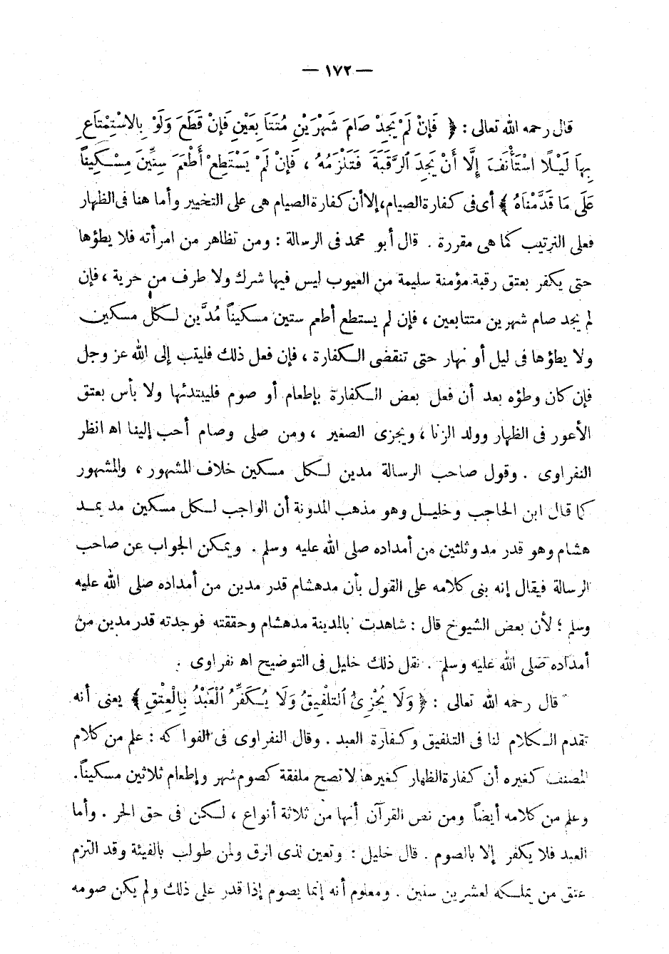 قال رحمه الله تعالى: " فإن لم يجد صيام شهرين متتابعين، فإن قطع ولو بالاستمتاع بها ليلاً استأنف إلا أن يجد الرقبة فتلزمه، فإن لم يستطع أطعم ستين مسكيناً على ما قدمناه " أي في كفارة الصيام، إلا أن كفارة الصيام هي على التخييرو أما هنا في الظهار فعلى الترتيب كما هي مقررة. قال أبو محمد في الرسالة: ومن تظاهر من امرأته فلا يطؤها حتى يكفر بعتق رقبة مؤمنة سليمة من العيوب ليس فيها شرك ولا طرف من حرية، فإن لم يجد صيام شهرين متتابعين، فإن لم يستطع أطعم ستين مسكيناً مدين لكل مسكين ولا يطؤها في ليل أو نهار حتى تنقضي الكفارة، فإن فعل ذلك فليتب إلى الله عز وجل فإن كان وطؤه بعد أن فعل بعض الكفارة بإطعام أو صوم فليبتدئها ولا بأس بعتق الأعور في الظهار وولد الزنا، ويجزَى الصغير، ومن صلى وصام أحب إلينا اهـ. انظر النفراوي. وقول صاحب الرسالة مدين لكل مسكين خلاف المشهور، والمشهور كما قال ابن الحاجب وخليل وهو مذهب المدونة أن الواجب لكل مسكين مد بمد هشام وهو قدر مد وثلثين من أمداده صلى الله عليه وسلم. ويمكن الجواب عن صاحب الرسالة فيقال: إنه بنى كلامه على القول بأن مد هشام قدر مدين من أمداده صلى الله عليه وسلم، لأن بعض الشيوخ قال: شاهدت بالمدينة مد هشام وحققته فوجدته قدر مدين من أمداده صلى الله عليه وسلم. نقل ذلك خليل في التوضيح اهـ. النفراوي.