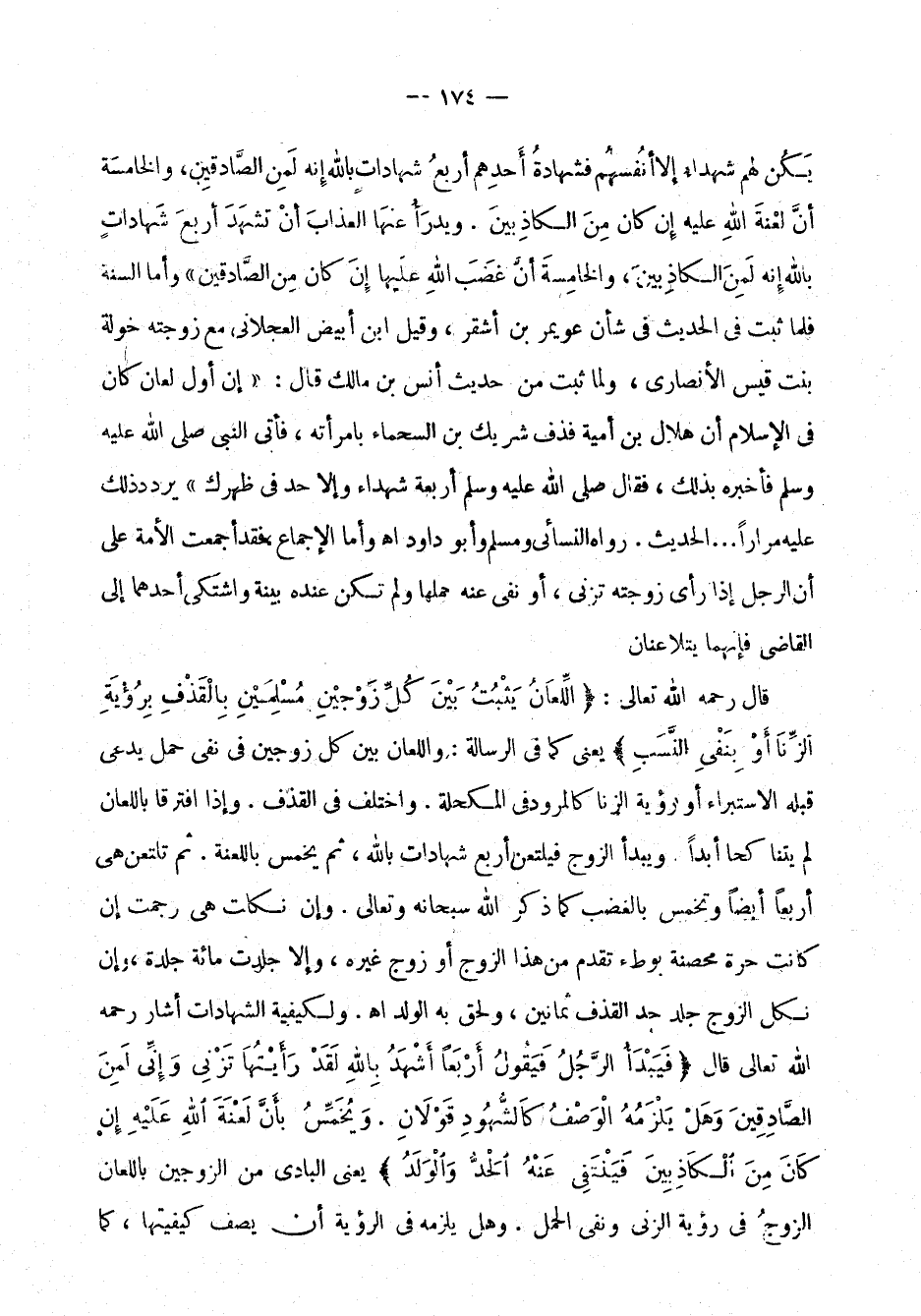 قال رحمه الله تعالى: " اللعان يثبت بين كل زوجين مسلمين بالقذف برؤية الزنا أو بنفي النسب " يعني كما في الرسالة: واللعان بين كل زوجين في نفي حمل يدعى قبله الاستبراء أو رؤية الزنا كالمرود في المكحلة. واختُلف في القذف. وإذا افترقا باللعان لم يتناكحا أبداً. ويبدأ الزوج فيلتعن أربع شهادات بالله، ثم يخمس