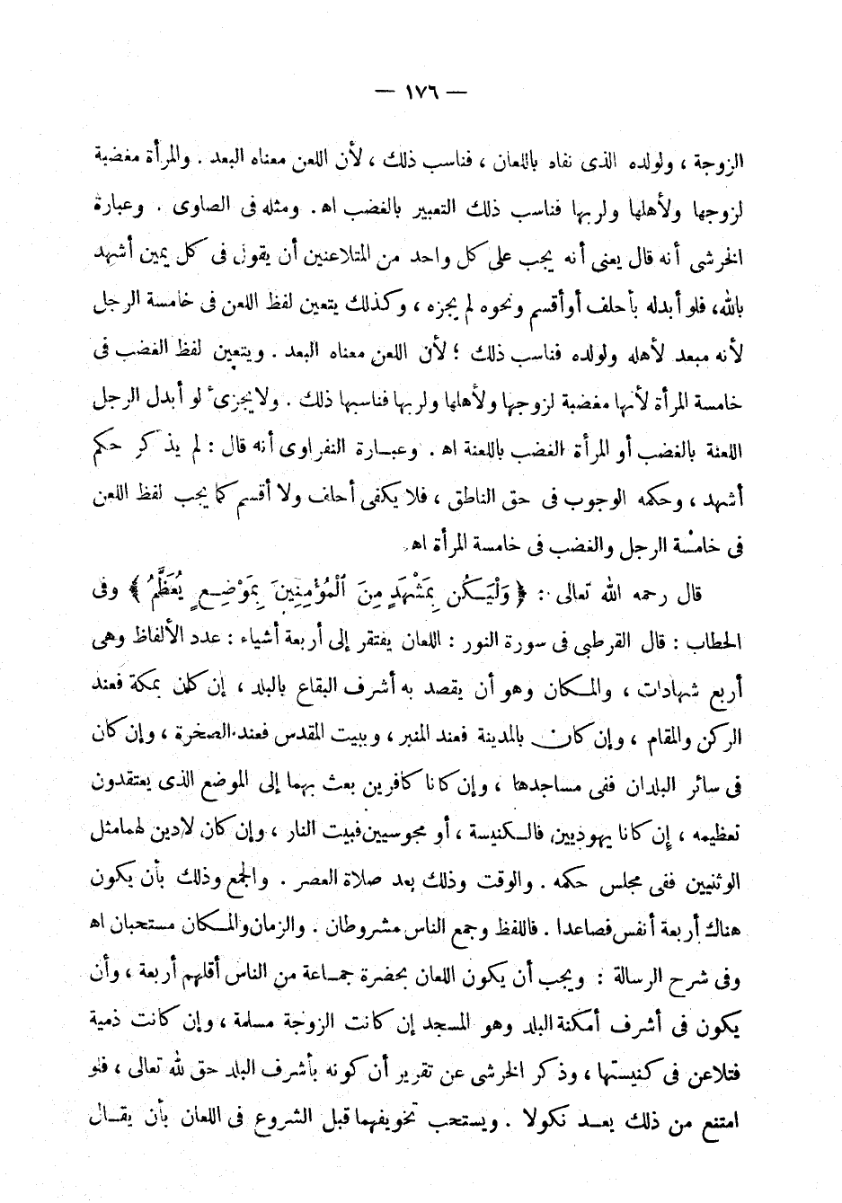ولربها فناسب ذلك التعبير بالغضب اهـ. ومثله في الصاوي: وعبارة الخرشي أنه قال يعني أنه يجب على كل واحد من المتلاعنين أن يقول في كل يمين أشهد بالله، فلو أبدله بأحلف أو أقسم ونحوه لم يجزه، وكذلك يتعين لفظ اللعن في خامسة الرجل لأنه مبعد لأهله ولولده فناسب ذلك، لأن اللعن معناه البعد. ويتعين لفظ الغضب في خامسة المرأة لأنها مغضبة لزوجها ولأهلها ولربها فناسبها ذلك. ولا يجزئ لو أبدل الرجل اللعنة بالغضب أو المرأة الغضب باللعنة اهـ. وعبارة النفراوي أنه قال: لم يذكر حكم أشهد، حكمه الوجوب في حق الناطق، فلا يكفي أحلف ولا أقسم كما يجب لفظ اللعن في خامسة الرجل والغضب في خامسة المرأة اهـ.