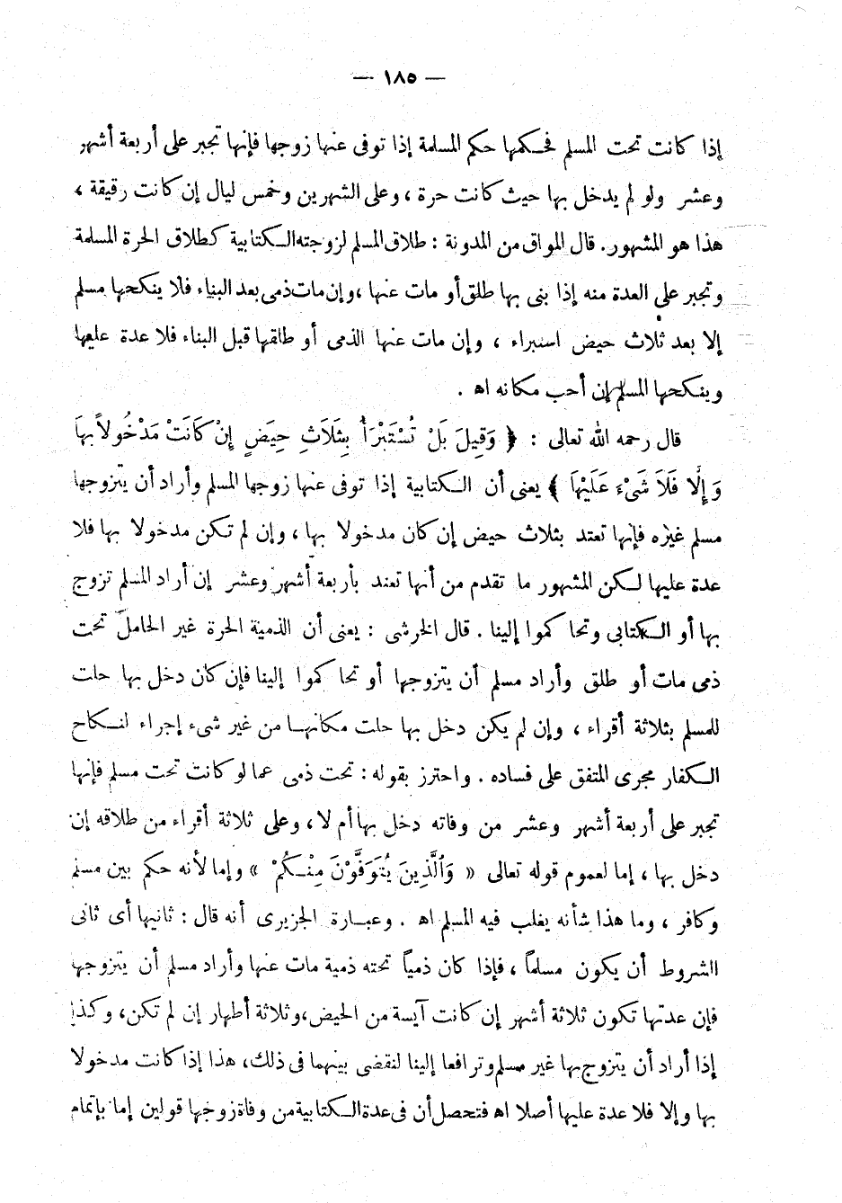 يتوفون منكم} وإما لأنه حكم بين مسلم وكافر، وما هذا شأنه يغلب فيه المسلم اهـ. وعبارة الجزيري أنه قال: ثانيها أي ثاني الشروط أن يكون مسلماً، فإذا كان ذمياً تحته ذمية مات عنها وأراد مسلم أن يتزوجها فإن عدتها تكون ثلاثة أشهر إن كانت آيسة من الحيض، وثلاثة أطهار إن لم تكن، وكذا إذا أراد أن يتزوج بها غير مسلم وترافعا إلينا لنقضي بينهما في ذلك، هذا إذا كانت مدخولاً بها وإلا فلا عدة عليها أصلاً اهـ فتحصَّل أن في عدة الكتابية من وفاة زوجها قولين إما بإتمام