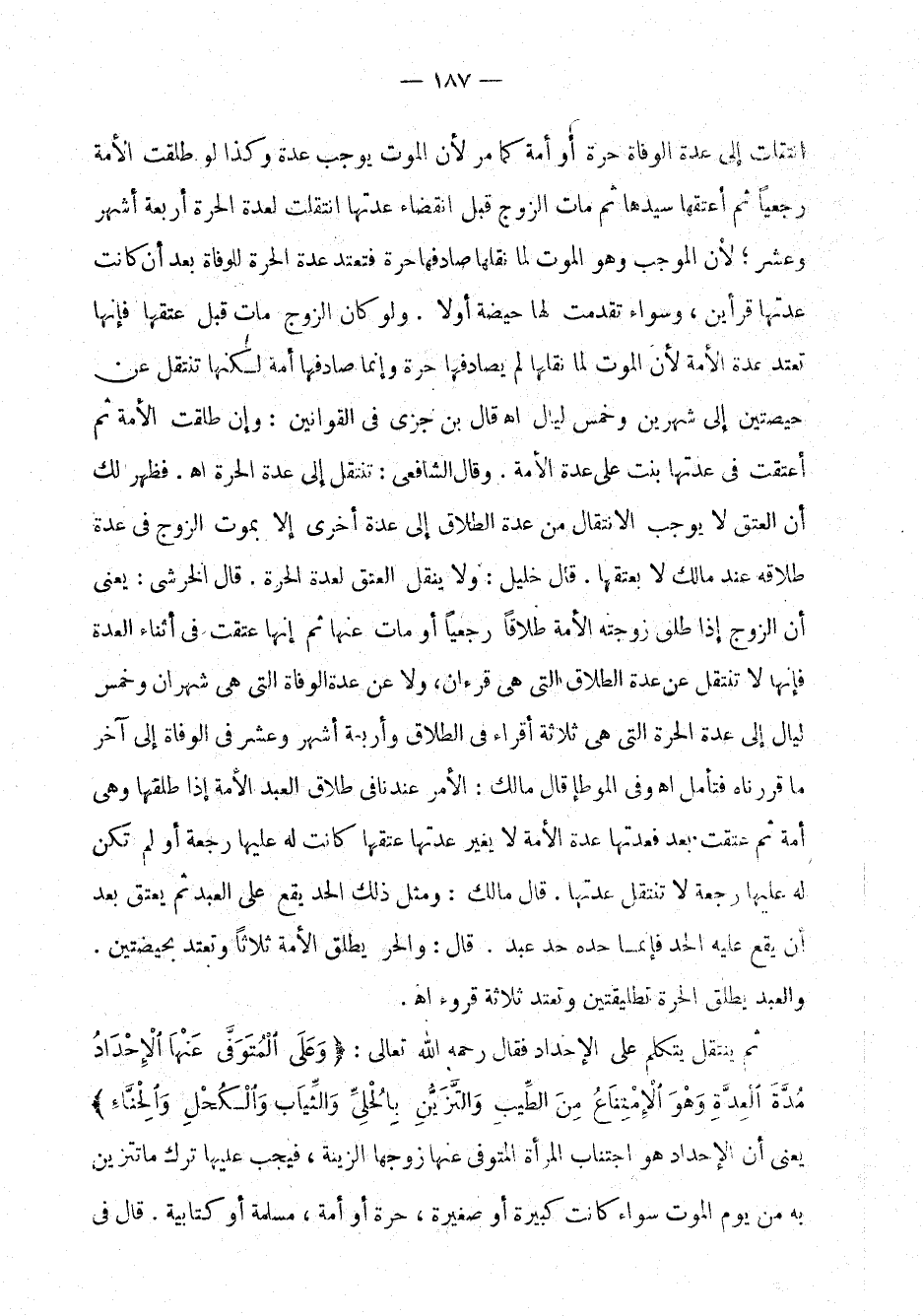 ثم ينتقل يتكلم على الإحداد فقال رحمه الله تعالى: " وعلى المتوفى عنها الإحداد مدة العدة وهو الامتناع من الطيب والتزين بالحلي والثياب والكحل والحناء " يعني أن الإحداد هو اجتناب المرأة المتوفى عنها زوجها الزينة، فيجب عليها ترك ما تتزين به من يوم الموت سواء كانت كبيرة أو صغيرة، حرة أو أمة، مسلمة أو كتابية. قال في