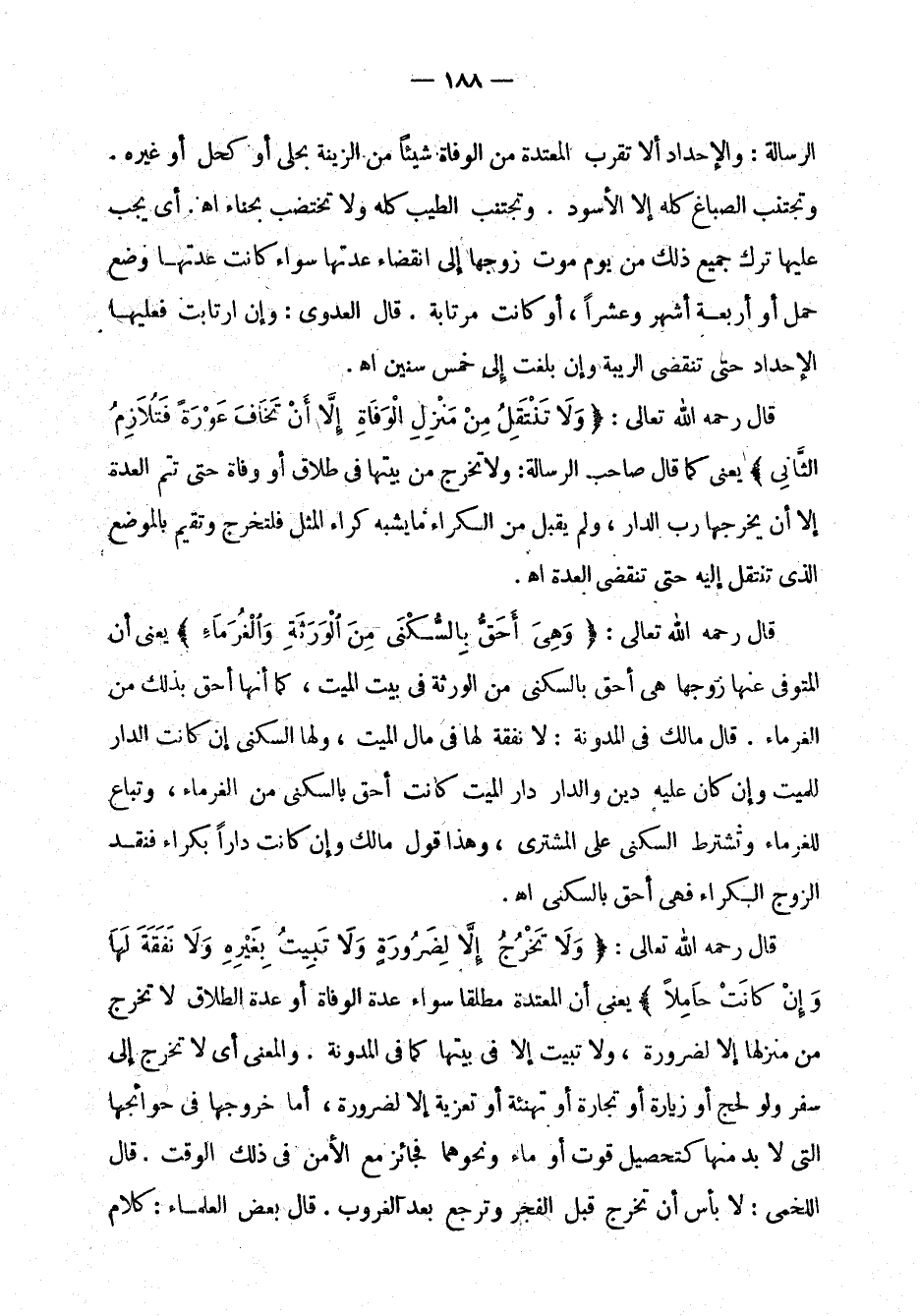 قال رحمه الله تعالى: " ولا تخرج إلا لضرورة ولا تبيت بغيره ولا نفقة لها وإن كانت حاملاً " يعني أن المعتدة مطلقاً سواء عدة الوفاة أو عدة الطلاق لا تخرج من منزلها إلا لضرورة، ولا تبيت إلا في بيتها كما في المدونة. والمعنى أي لا تخرج إلى سفر ولو لحج أو زيارة أو تجارة أو تهنئة أو تعزية إلا لضرورة، أما خروجها في حوائجها التي لا بد منها كتحصيل قوت أو ماء ونحوهما فجائز مع الأمن في ذلك الوقت. قال اللخمي: لا بأس أن تخرج قبل الفجر وترجع قبل الغروب. قال بعض العلماء: كلام