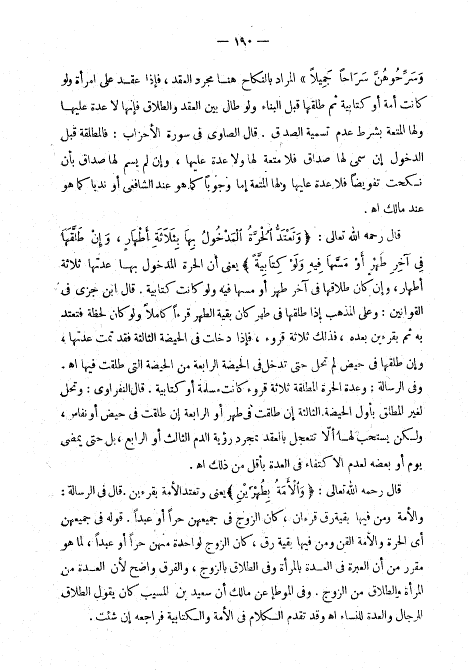 وسرحوهن سراحاً جميلاً} [الأحزاب: 49] المراد بالنكاح هنا مجرد العقد، فإذا عقد على امرأة ولو كانت أمة أو كتابية ثم طلقها قبل البناء ولو طال بين العقد والطلاق فإنها لا عدة عليها ولها المتعة بشرط عدم تسمية الصداق. قال الصاوي في سورة الأحزاب: فالمطلقة قبل الدخول إن سمي لها صداق فلا متعة لها ولا عدة عليها، وإن لم يسم لها صداق بأن نكحت تفويضاً فلا عدة عليها ولها المتعة إما وجوباً كما هو عند الشافعي أو ندباً كما هو عند مالك اهـ.