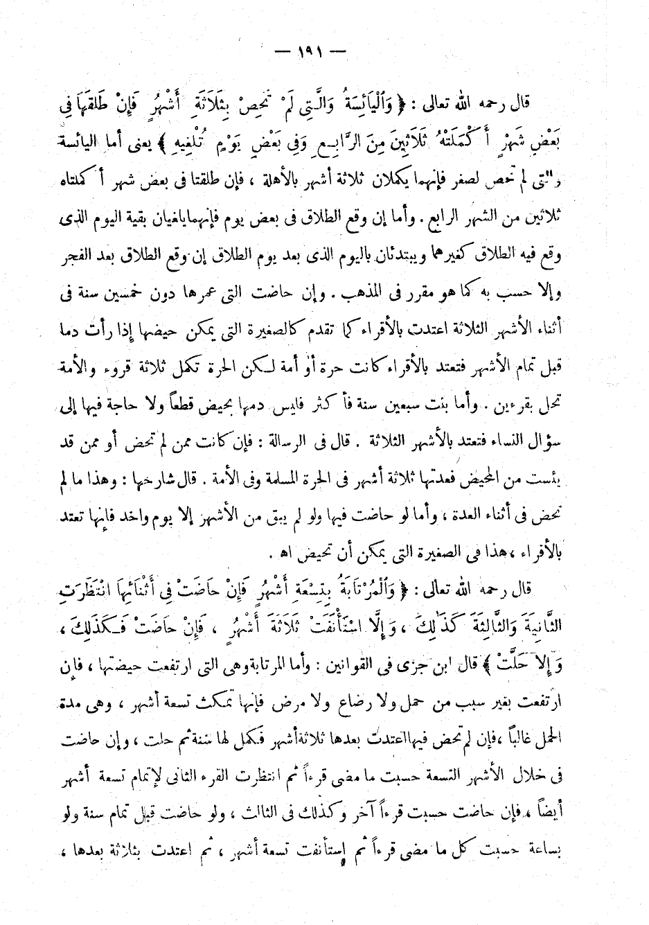 الذي وقع فيه الطلاق كغيرهما وتبتدئان باليوم الذي بعد يوم الطلاق إن وقع الطلاق بعد الفجر وإلا حسب به كما هو مقرر في المذهب. وإن حاضت التي عمرها دون خمسين سنة في أثناء الأشهر الثلاثة اعتدت بالأقراء كما تقدم كالصغيرة التي يمكن حيضها إذا رأت دماً قبل تمام الأشهر فتعتد بالأقراء كانت حرة أو أمة لكن الحرة تكمل ثلاثة قروء والأمة تحل بقرءين. وأما بنت سبعين سنة فأكثر فليس دمها بحيض قطعاً ولا حاجة فيها إلى سؤال النساء فتعتد بالأشهر الثلاثة. قال في الرسالة: فإن كانت ممن لم تحض أو ممن قد يئست من المحيض فعدتها ثلاثة أشهر في الحرة المسلمة وفي الأمة. قال شارحها: وهذا ما لم تحض في أثناء العدة، وأما لو حاضت فيها ولو لم يبق من الأشهر إلا يوم واحد فإنها تعتد بالأقراء، هذا في الصغيرة التي يمكن أن تحيض اهـ.