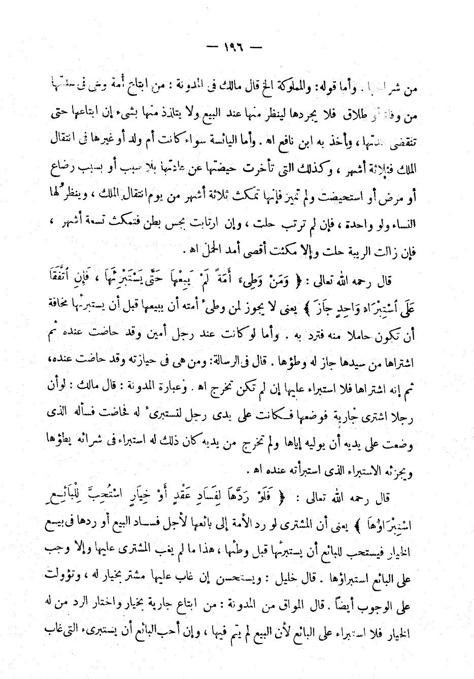 من شراحها. وأما قوله: والمملوكة الخ قال مالك في المدونة: من ابتاع أمة وهي في سنتها من وفاة أو طلاق فلا يجردها لينظر منها عند البيع ولا يتلذذ منها بشيء إن ابتاعها حتى تنقضي عدتها، وأخذ به ابن نافع اهـ، وأما اليائسة سواء كانت أم ولد أو غيرها في انتقال الملك فثلاثة أشهر، وكذلك التي تأخرت حيضتها عن عادتها بلا سبب أو بسبب رضاع أو مرض أو استحيضت ولم تميز فإنها تمكث ثلاثة أشهر من يوم انتقال الملك، وينظر لها النساء ولو واحدة، فإن لم ترتب حلت، وإن ارتابت بجس بطن فتمكث تسعة أشهر، فإن زالت الريبة حلت وإلا مكثت أقصى أمد الحمل اهـ.
