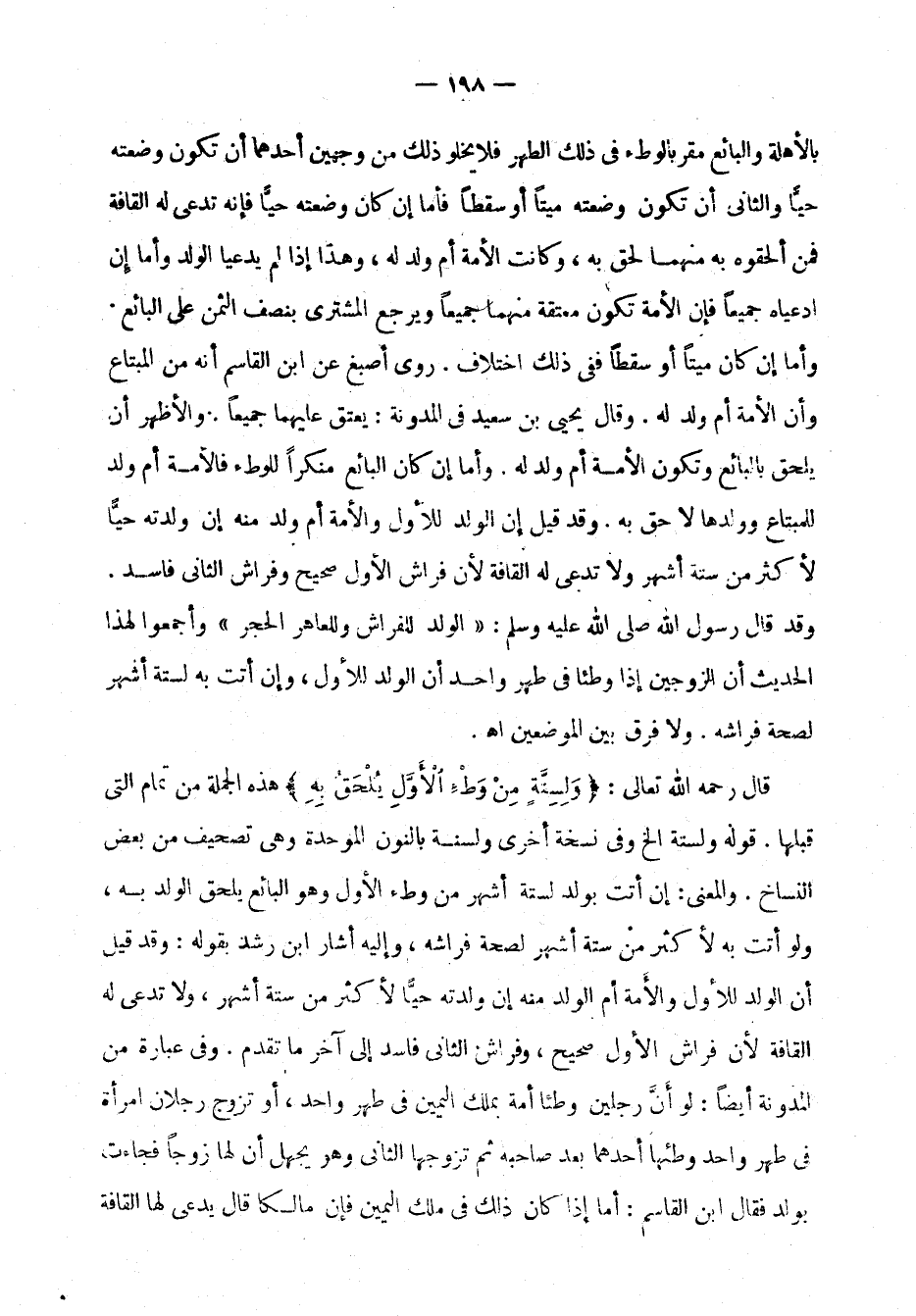 روى أصبغ عن ابن القاسم أنه من المبتاع وأن الأمة أم ولد له. قال يحيى بن سعيد في المدونة: يعتق عليهما جميعاً. والأظهر أن يلحق بالبائع وتكون الأمة أم ولد له. وأما إن كان البائع منكراً للوطء فالأمة أم ولد للمبتاع وولدها لاحق به. وقد قيل إن الولد للأول والأمة أم ولد منه إن ولدته حياً لأكثر من ستة أشهر ولا تدعى له القافة لأن فراش الأول صحيح وفراش الثاني فاسد. وقد قال رسول الله صلى الله عليه وسلم: (الولد للفراش وللعاهر الحجر) وأجمعوا لهذا الحديث أن الزوجين إذا وطئا في طهر واحد أن الولد للأول، وإن أتت به لستة أشهر لصحة فراشه. ولا فرق بين الموضعين اهـ.