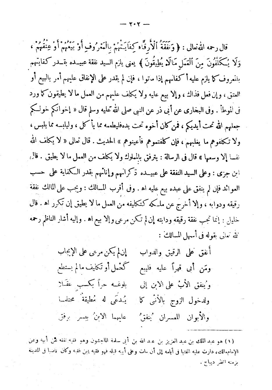 (إخوانكم خولكم جعلهم الله تحت أيديكم، فمن كان أخوه تحت يده فليطعمه مما يأكل، وليلبسه مما يلبس، ولا تكلفوهم ما يغلبهم، فإن كلفتموهم فأعينوهم) الحديث. قال تعالى: {لا يكلف الله نفساً إلا وسعها} [البقرة: 286] قال في الرسالة: يترفق بالمملوك ولا يكلف من العمل ما لا يطيق. قال ابن جزي: وعلى السيد النفقة على عبيده ذكرانهم وإناثهم بقدر الكفاية على حسب العوائد فإن لم ينفق على عبده بيع عليه اهـ. وفي أقرب المسالك: ويجب على المالك نفقة رقيقه ودوابه، وإلا أخرج عن ملكه كتكليفه من العمل ما لا يطيق إن تكرر اهـ. قال خليل: إنما تجب نفقة رقيقه ودابته إن لم تكن مرعى وإلا بيع اهـ. وإليه أشار الناظم رحمه الله تعالى بقوله في أسهل المسالك:
