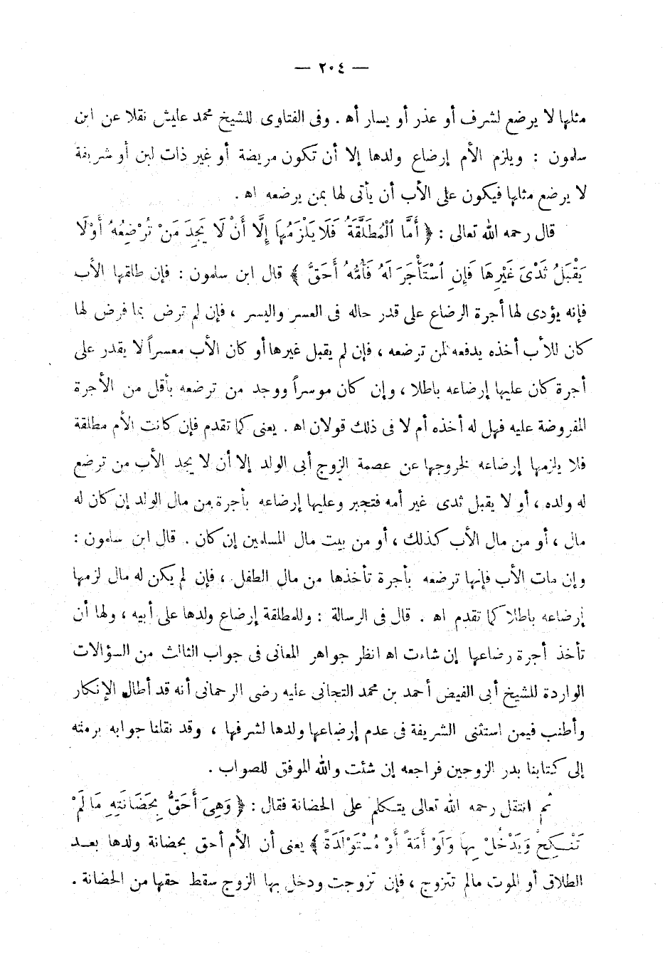 قال رحمه الله تعالى: " أما المطلقة فلا يلزمها إلا أن لا يجد من ترضعه أو لا يقبل ثدي غيرها فإن استأجر له فأمه أحق " قال ابن سلمون: فإن طلقها الأب فإنه يؤدي لها أجرة الرضاع على قدر حاله في العسر واليسر، فإن لم ترض بما فرض لها كان للأب أخذه يدفعه لمن ترضعه، فإن لم يقبل غيرها أو كان الأب معسراً لا يقدر على أجرة كان عليها إرضاعه باطلاً، وإن كان موسراً ووجد من ترضعه بأقل من الأجرة المفروضة عليه فهل عليه أخذه أم لا في ذلك قولان اهـ. يعني كما تقدم فإن كانت الأم مطلقة فلا يلزمها إرضاعه لخروجها عن عصمة الزوج أبي الولد إلا إن لا يجد الأب من لا ترضع له ولده، أو لا يقبل ثدي غير أمه فتجبر وعليها إرضاعه بأجرة من مال الولد إن كان له مال، أو من مال الأب كذلك، أو من بيت مال المسلمين إن كان. قال ابن سلمون: وإن مات الأب فإنها ترضعه بأجرة تأخذها من مال الطفل، فإن لم يكن له مال لزمها إرضاعه باطلاً كما تقدم اهـ. قال في الرسالة: وللمطلقة إرضاع ولدها على أبيه، ولها أن تأخذ أجرة رضاعه إن شاءت اهـ انظر جواهر المعاني في جواب الثالث من السؤالات الواردة للشيخ أبي الفيض أحمد بن محمد التجاني عليه رضى الرحماني أنه قد أطال الإنكار وأطنب فيمن استثنى الشريفة في عدم إرضاعها ولدها لشرفها، وقد نقلنا جوابه برمته إلى كتابنا بدر الزوجين فراجعه إن شئت والله الموفق للصواب.