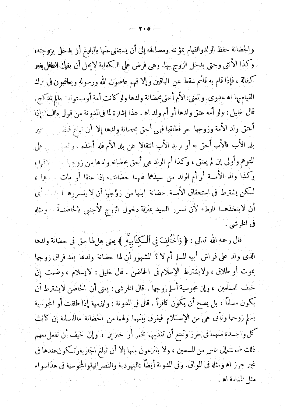 والحضانة حفظ الولد والقيام بمؤونته ومصالحه إلى أن يستغني عنها بالبلوغ أو يدخل بزوجته، وكذا الأنثى وحتى يدخل الزوج بها. وهي فرض على الكفاية لا يحل أن يترك الطفل بغير كفالة، فإذا قام به قائم سقط عن الباقين وإلا فهم عاصون الله ورسوله ويعاقبون في ترك القيام بها اهـ العدوي. والمعنى: الأم أحق بحضانة ولدها ولو كانت أمة أو مستولدة ما لم تنكح. قال خليل: ولو أمة عتق ولدها أو أم ولد اهـ. هذا إشارة لما في المدونة من قول مالك: إذا أعتق ولد الأمة وزوجها حر فطلقها فهي أحق بحضانة ولدها إلا أن تباع فتظعن إلى غير بلد الأب فالأب أحق به أو يريد الأب انتقالاً عن بلد الأم فله أخذه. والعتق نص على المتوهم وأولى إن لم يعتق، وكذا أم الولد هي أحق بحضانة ولدها من زوجها بعد طلاقها، وكذا ولد الأمة أو أم الولد من سيدهما فلهما حضانته إذا عتقا أو مات سيدهما، لكن يشترط في استحقاق الأمة حضانة ابنها من زوجها أن لا يتسررها السيد أي لا يتخذها للوطء لأن تسرر السيد بمنزلة دخول الزوج الأجنبي بالحاضنة اهـ ومثله في الخرشي.