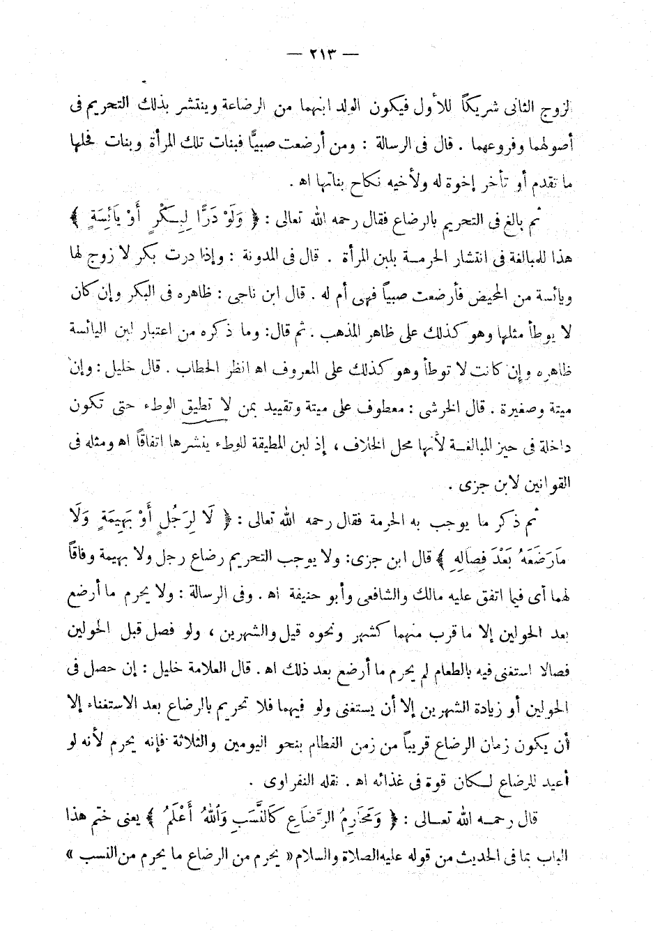 الزوج الثاني شريكاً للأول فيكون الولد ابنهما من الرضاعة وينتشر التحريم في أصولهما وفروعهما. قال في الرسالة: ومن أرضعت صبياً فبنات تلك المرأة وبنات فحلها ما تقدم أو تأخر إخوة له ولأخيه نكاح بناتها اهـ.