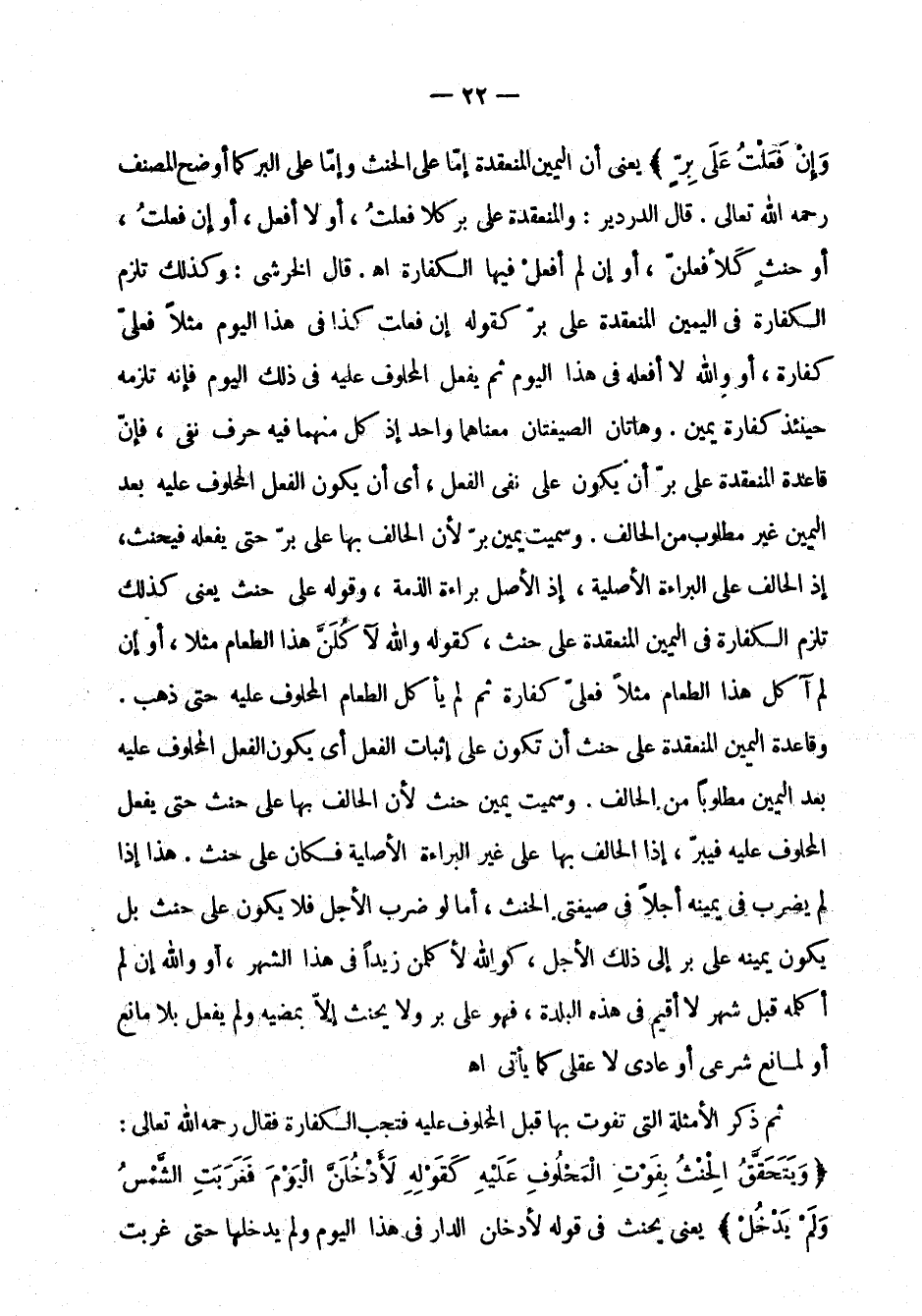 وإن فعلت على بر " يعني أن اليمين المنعقدة إما على الحنث وإما على البر كما أوضح المصنف رحمه الله تعالى. قال الدردير: والمنعقدة على بر كلا فعلت، أو لا أفعل، أو إن فعلت، أو حنث كلأفعلن، أو إن لم أفعل فيها الكفارة اهـ. قال الخرشي: وكذلك تلزم الكفارة في اليمين المنعقدة على بر كقوله إن فعلت كذا في هذا اليوم مثلاً فعلي كفارة، أو والله لا أفعله في هذا اليوم ثم يفعل المحلوف عليه في ذلك اليوم فإنه تلزمه حينئذ كفارة يمين. وهاتان الصيغتان معناهما واحد إذ كل منهما فيه حرف نفي، فإن قاعدة المنعقدة على بر أن يكون على نفي الفعل، أي أن يكون الفعل المحلوف عليه بعد اليمين غير مطلوب من الحالف. وسميت يمين بر لأن الحالف بها على بر حتى يفعله فيحنث، إذ الحالف على البراءة الأصلية، إذ الأصل براءة الذمة، وقوله على حنث يعني كذلك تلزم الكفارة في اليمين المنعقدة على حنث، كقوله والله لآكلن هذا الطعام مثلاً، أو إن لم آكل هذا الطعام مثلاً فعلي كفارة ثم لم يأكل الطعام المحلوف عليه حتى ذهب. وقاعدة اليمين المنعقدة على حنث أن تكون على إثبات الفعل أي يكون الفعل المحلوف عليه بعد اليمين مطلوباً من الحالف. وسميت يمين حنث لأن الحالف بها على حنث حتى يفعل المحلوف عليه فيبر، إذ الحالف بها على غير البراءة الأصلية فكان على حنث. هذا إذا لم يضرب في يمينه أجلاً في صيغتي الحنث، أما لو ضرب الأجل فلا يكون على حنث بل يكون يمينه على بر إلى ذلك الأجل، كوالله لأكلمن زيداً في هذا الشهر، أو والله إن لم أكلمه قبل شهر لا أقيم في هذه البلدة، فهو على بر ولا يحنث إلا بمضيه ولم يفعل بلا مانع أو لمانع شرعي أو عادي لا عقلي كما يأتي اهـ.