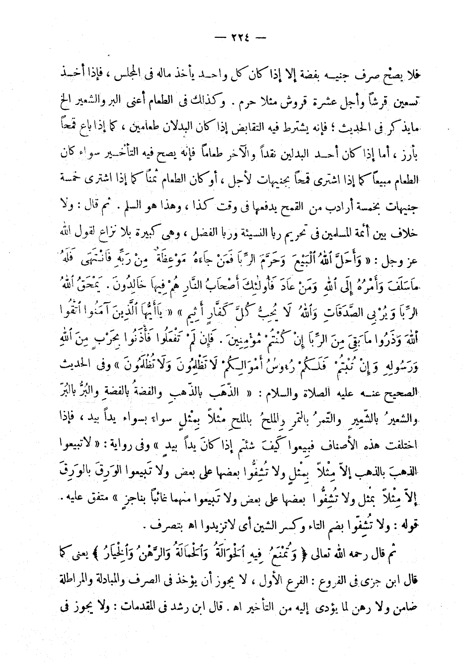 فلا يصح صرف جنيه بفضة إلا إذا كان كل واحد يأخذ ماله في المجلس، فإذا أخذ تسعين قرشاً وأجل عشرة قروش مثلاً حرم، وكذلك في الطعام أعني البر والشعير