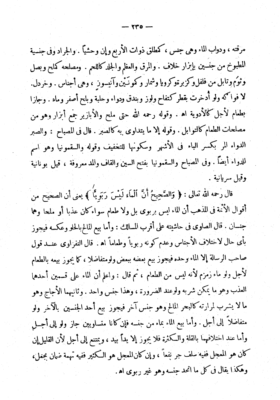 مرقته، ودواب الماء وهي جنس، كمطلق ذوات الأربع وإن وحشياً. والجراد وفي جنسية المطبوخ من جنسين بإبزار خلاف. والمرق والعظم والجلد كاللحم، ومصلحه كملح وبصل وثوم وتابل من فلفل وكزبرة وكرويا وشمار وكمونين وآنيسون، وهي أجناس. وخردل. لا فواكه ولو أدخرت بقطر كتفاح ولوز وبندق ودواء وحلبة وبلح أصفر وماء. وجازا بطعام لأجل كالأدوية اهـ. وقوله رحمه الله: حتى ملح والأبازير جمع أبزار وهو من مصلحات الطعام كالتوابل. وقوله: إلا ما يتدواى به كالصبر. قال في المصباح: والصبر الدواء المر بكسر الباء في الأشهر وسكونها للتخفيف وقوله: والسقمونيا وهو اسم للدواء أيضاً. وفي المصباح والسقمونيا بفتح السين والقاف والمد معروفة، قيل يونانية وقيل سريانية.