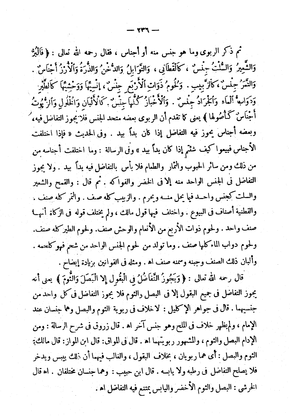 والشعير والسلت جنس، كالقطاني، والتوابل والدخن والذرة والأرز أجناس. والتمر جنس، كالزبيب. ولحوم ذوات الأربع جنس، إنسيها ووحشيها كالطير، ودواب الماء والجراد جنس. والأخباز كلها جنس. كالألبان والخلول والزيوت أجناس كأصولها " يعني كما تقدم أن الربوي بعضه متحد الجنس فلا يجوز التفاضل فيه، وبعضه أجناس يجوز فيه التفاضل إذا كان يداً بيد. وفي الحديث (فإذا اختلفت الأجناس فبيعوا كيف شئتم إذا كان يداً بيد) وفي الرسالة: وما اختلفت أجناسه من ذلك ومن سائر الحبوب والثمار والطعام فلا بأس بالتفاضل فيه يداً بيد. ولا يجوز التفاضل في الجنس الواحد منه إلا في الخضر والفواكه. ثم قال: والقمح والشعير والسلت كجنس واحد فيما يحل منه ويحرم. والزبيب كله صنف. والقطنية أصناف في البيوع. واختلف فيها قول مالك، ولم يختلف قوله في الزكاة أنها صنف واحد. ولحوم ذوات الأربع من الأنعام والوحش صنف. ولحوم الطير كله صنف. ولحوم دواب الماء كلها صنف. وما تولد من لحوم الجنس الواحد من شحم فهو كلحمه. وألبان ذلك الصنف وجبنه وسمنه صنف اهـ. ومثله في القوانين بزيادة إيضاح.