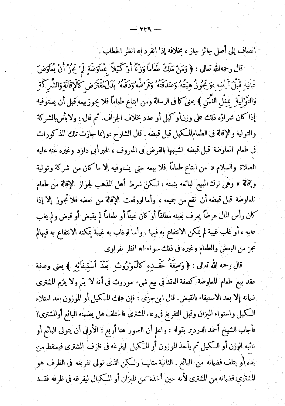 قال رحمه الله تعالى: " ومن ملك طعاماً وزناً أو كيلاً بمعاوضة لم يجز أن يعاوض عليه قبل قبضه، ويجوز هبته وصدقته وقرضه ودفعه بدل مقترض كالإقالة والشركة والتولية بمثل الثمن " يعني كما في الرسالة ومن ابتاع طعاماً فلا يجوز بيعه قبل أن يستوفيه إذا كان شراؤه ذلك على وزن أو كيل أو عدد بخلاف الجزاف. ثم قال: ولا بأس بالشركة والتولية والإقالة في الطعام المكيل قبل قبضه. قال الشارح: وإنما جازت تلك المذكورات في طعام المعاوضة قبل قبضه لشبهها بالقرض في المعروف، لخبر أبي داود وغيره عنه عليه الصلاة والسلام: (من ابتاع طعاماً فلا يبعه حتى يستوفيه إلا ما كان من شركة وتولية وإقالة) وهي ترك المبيع لبائعه بثمنه، لكن شرط أهل المذهب لجواز الإقالة من طعام المعاوضة قبل قبضه أن تقع من جميعه، وأما لو وقعت الإقالة من بعضه فلا تجوز إلا إذا كان رأس المال عرضاً يعرف بعينه مطلقاً أو كان عيناً أو طعاماً لم يقبض أو قبض ولم يغب عليه، أو غاب غيبة لم يمكن الانتفاع به فيها. وأما لو غاب به غيبة يمكنه الانتفاع به فيها لم تجز من البعض والطعام وغيره في ذلك سواء اهـ انظر النفراوي.