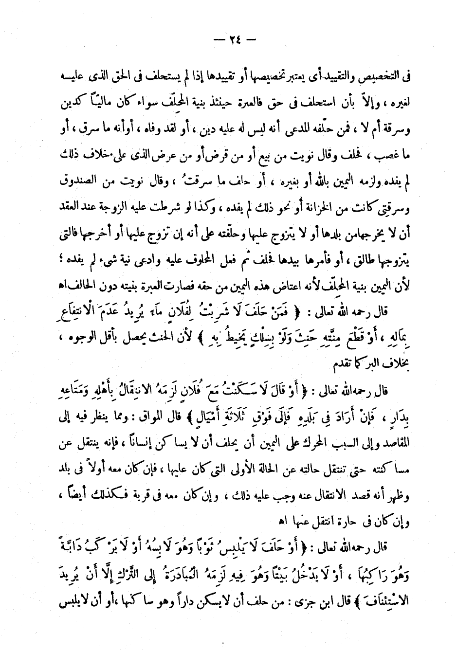 في التخصيص والتقييد أي يعتبر تخصيصها أو تقييدها إذا لم يسلتحف في الحق الذي عليه لغيره، وإلا بأن استحلف في حق فالعبرة حينئذ بنية المحلف سواء كان مالياً كدين وسرقة أم لا، فمن حلفه المدعي أنه ليس له عليه دين، أو لقد وفاه، أو أنه ما سرق، أو ما غصب، فحلف وقال نويت من بيع أو من قرض أو من عرض الذي على خلاف ذلك لم يفده ولزمه اليمين بالله أو