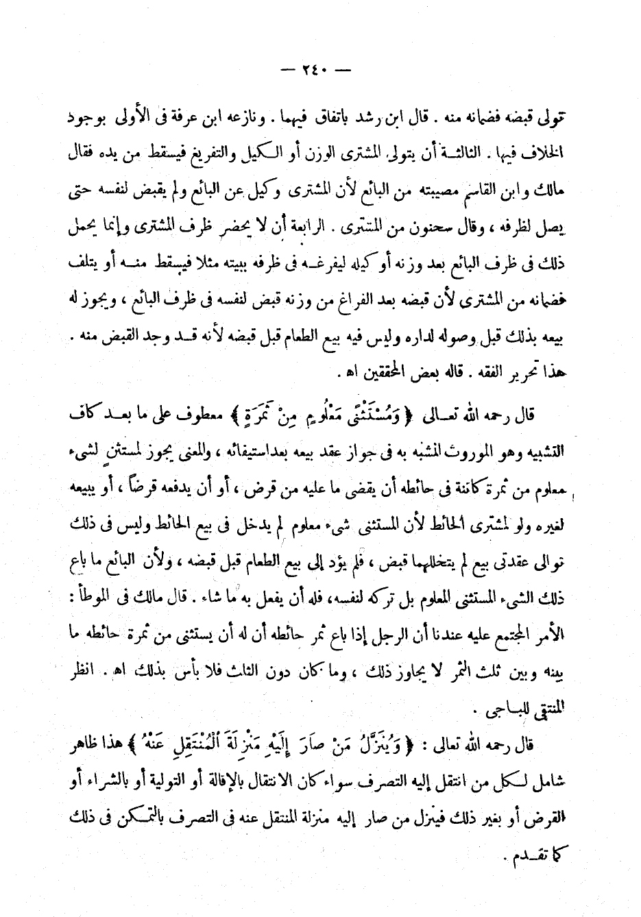 منه. قال ابن رشد باتفاق فيهما. ونازعه ابن عرفه في الأولى بوجود الخلاف فيها. الثالثة: أن يتولى المشتري الوزن أو الكيل والتفريغ فيسقط من يده فقال مالك وابن القاسم مصيبته من البائع ولم يقبض لنفسه حتى يصل لظرفه، وقال سحنون من المشتري. الرابعة: أن لا يحضر ظرف المشتري وإنما يحصل ذلك في ظرف البائع بعد وزنه أو كيله ليفرغه في ظرفه ببيته مثلاً فيسقط منه أو يتلف فضمانه من المشتري لأن قبضه بعد الفراغ من وزنه قبض لنفسه في ظرف البائع، ويجوز له بيعه بذلك قبل وصوله لداره وليس فيه بيع الطعام قبل قبضه لأنه قد وجد القبض منه. هذا تحرير الفقه. قاله بعض المحققين اهـ.
