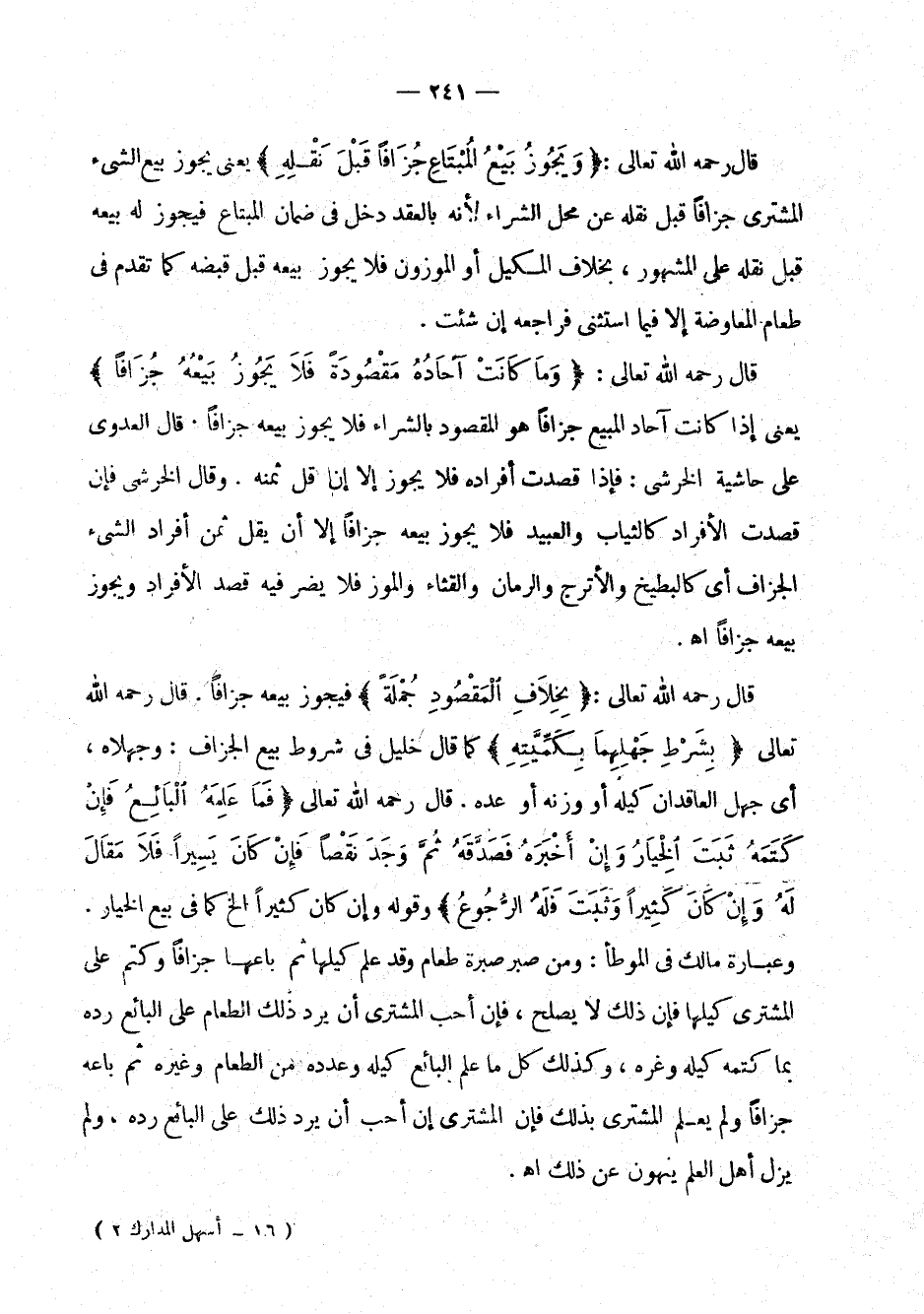 قال رحمه الله تعالى: " وما كانت آحاده مقصودة فلا يجوز بيعه جزافاً " يعني إذا كانت آحاد المبيع جزافاً هو المقصود بالشراء فلا يجوز بيعه جزافاً. قال العدوي على حاشية الخرشي: فإذا قصدت أفراده فلا يجوز إلا إن قل ثمنه. وقال الخرشي فإن قصدت الأفراد كالثياب والعبيد فلا يجوز بيعه جزافاً إلا أن يقل ثمن أفراد الشيء الجزاف أي كالبطيخ والأترج والرمان والقثاء والموز فلا يضر فيه قصد