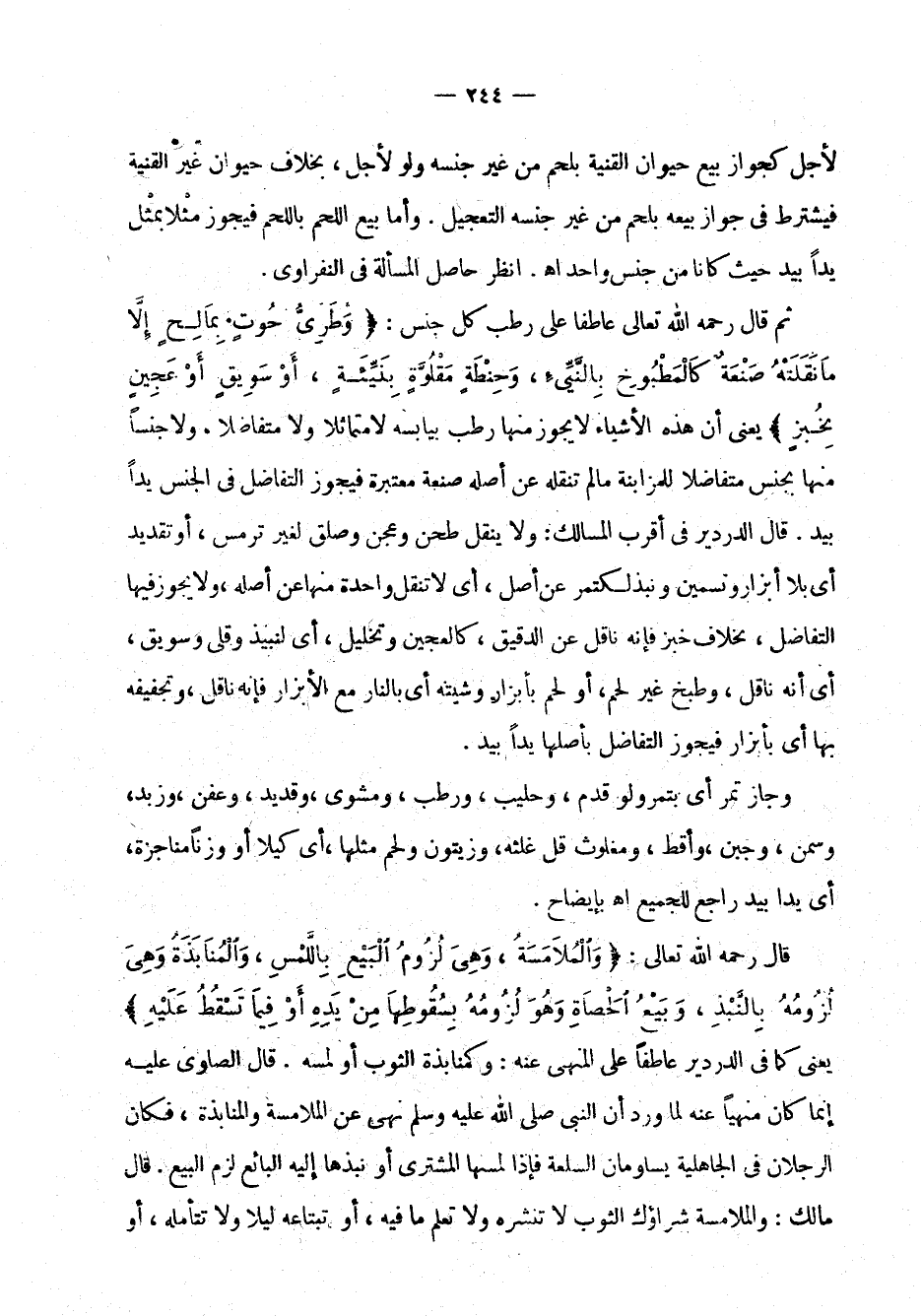 لأجل كجواز بيع حيوان القنية بلحم من غير جنسه ولو لأجل، بخلاف حيوان غير القنية فيشترط في جواز بيعه بلحم من غير جنسه التعجيل. وأما بيع اللحم باللحم فيجوز مثلاً بمثل يداً بيد حيث كانا من جنس واحد اهـ. انظر حاصل المسألة في النفراوي.