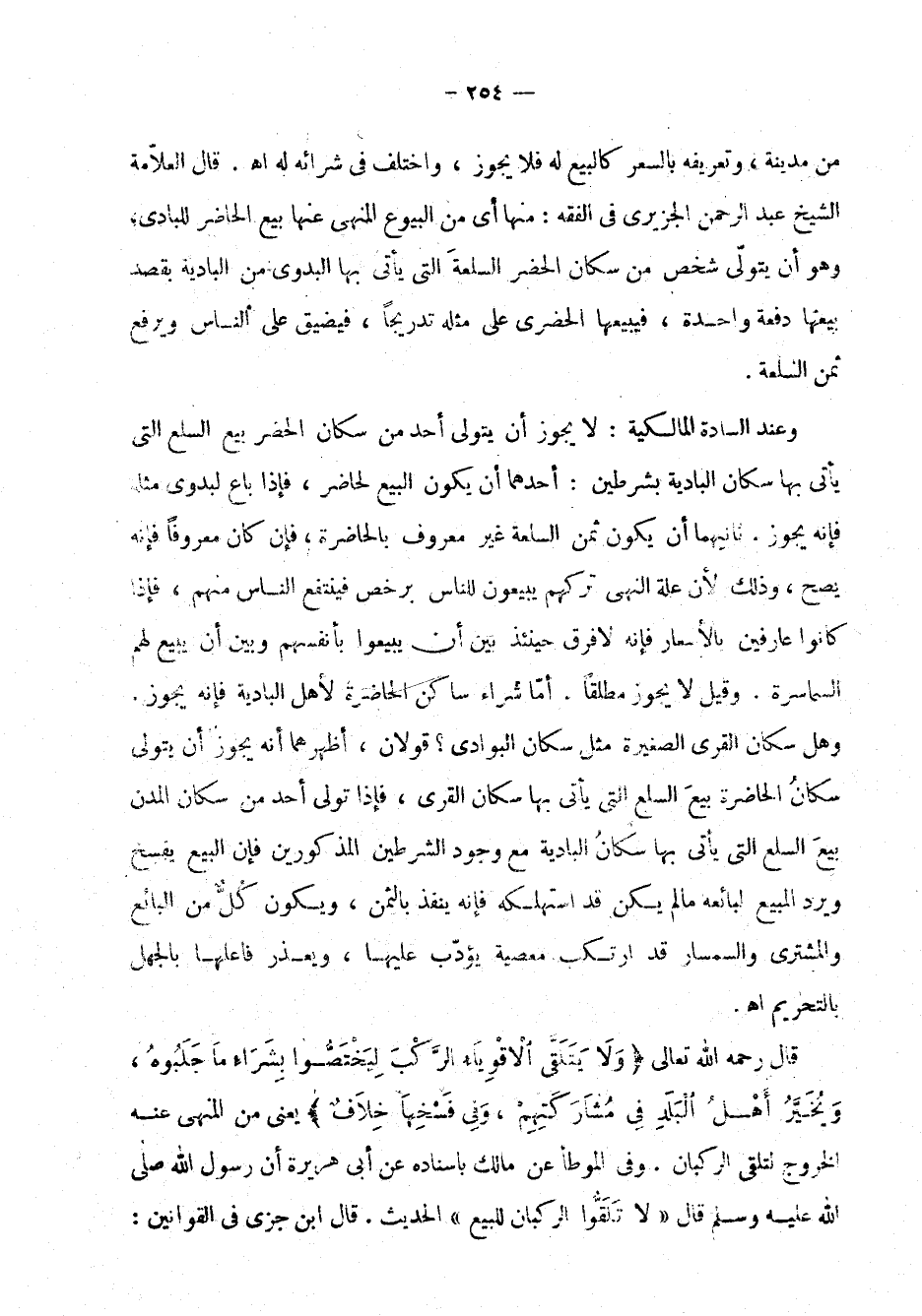 من مدينة، وتعريفه بالسعر كالبيع فلا يجوز، واختلف في شرائه له اهـ. قال العلامة الشيخ عبد الرحمن الجزيري في الفقه: منها أي من البيوع المنهي عنها بيع الحاضر للبادي، وهو أن يتولى شخص من سكان الحضر السلعة التي يأتي بها البدوي من البادية بقصد بيعتها دفعة واحدة، فبيعها الحضري على مثله تدرجاً، فيضيق على الناس ويرفع ثمن السلعة.