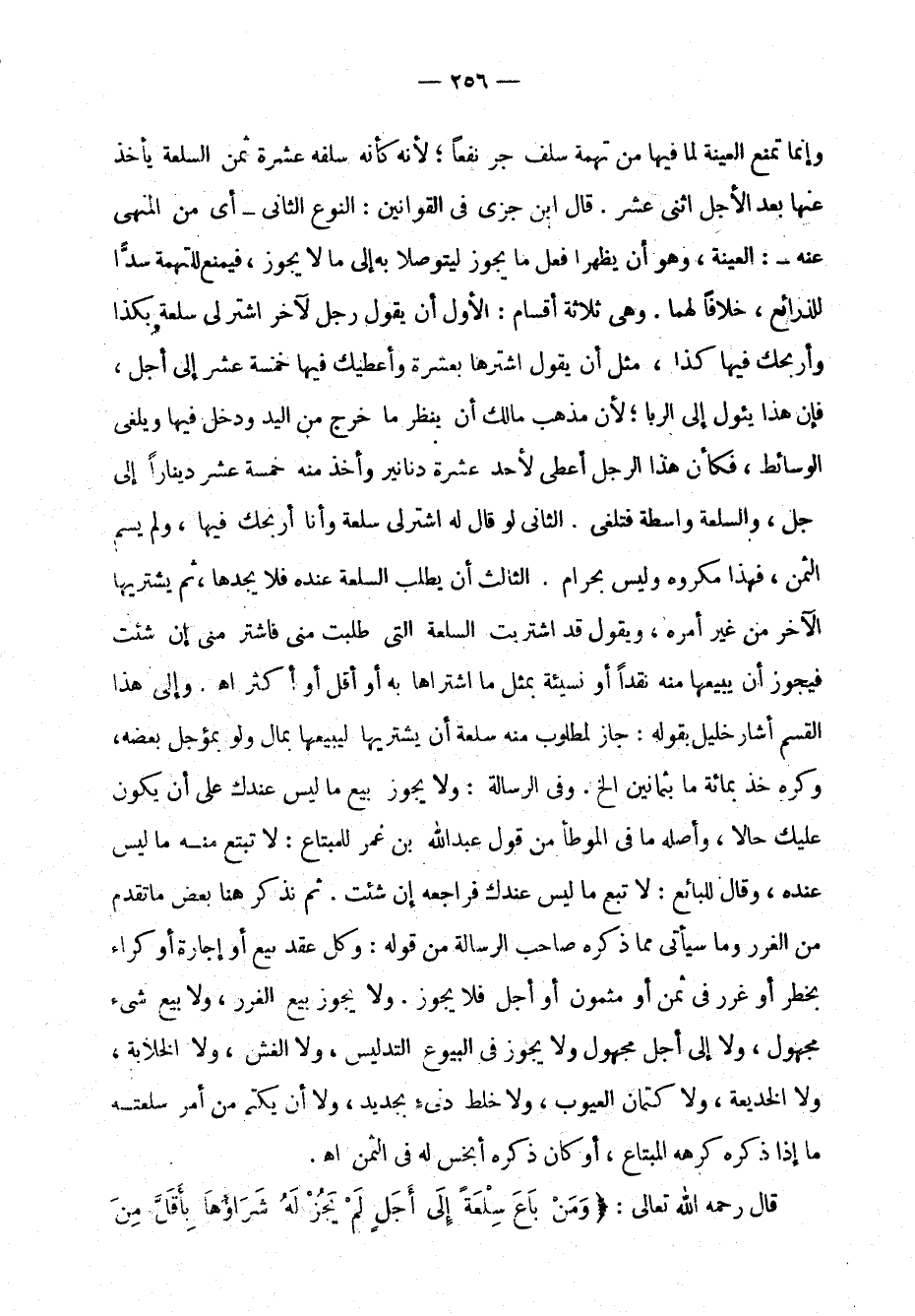 يبيعها منه نقداً أو نسيئة بمثل ما اشتراها به أقل أو أكثر اهـ. وإلى هذا القسم أشار خليل بقوله: جاز لمطلوب منه سلعة أن يشتريها ليبيعها بمال ولو بمؤجل بعضه، وكره خذ بمائة ما بثمانين إلخ. وفي الرسالة: ولا يجوز بيع ما ليس عندك على أن يكون عليك حالاً، وأصله ما في الموطأ من قول عبد الله بن عمر للمبتاع: لا تبتع منه ما ليس عنده، وقال للبائع: لا تبع ما ليس عندك فراجعه إن شئت. ثم نذكر هنا بعض ما تقدم من الغرر وما سيأتي مما ذكره صاحب الرسالة من قوله: وكل عقد بيع أو إجارة أو كراء يخطر أو غرر في ثمن أو مثمون أو أجل فلا يجوز. ولا يجوز بيع الغرر، ولا بيع شيء مجهول، ولا إلى أجل مجهول ولا يجوز في البيوع التدليس، ولا الغش، ولا الخلابة، ولا الخديعة، ولا كتمان العيوب، ولا خلط دنيء بجديد، ولا أن يكتم من أمر سلعته ما إذا ذكره كرهه المبتاع، أو كان ذكره أبخس له في الثمن اهـ.