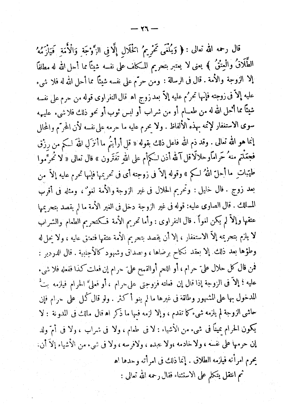 قال رحمه الله تعالى: " ويلغى تحريم الحلال إلا في الزوجة والأمة فيلزمه الطلاق والعتق " يعني لا يعتبر بتحريم المكلف على نفسه شيئاً مما أحل الله له مطلقاً إلا الزوجة والأمة. قال في الرسالة: ومن حرم على نفسه شيئاً مما أحل الله له فلا شيء عليه إلا في زوجته فإنها تحرم عليه إلا بعد زوج اهـ قال النفراوي قوله من حرم على نفسه شيئاً مما أحل الله له من طعام أو شراب أو لبس ثوب أو نحو ذلك فلا شيء عليه سوى الاستغفار لإثمه بهذه الألفاظ. ولا يحرم عليه ما حرمه على نفسه لأن المحرم والمحلل إنما هو الله تعالى. وقد ذم الله فاعل ذلك بقوله: {قل أرءيتم ما أنزل الله لكم من رزق فجعلتم منه حراماً وحلالاً قل ءالله أذن لكم أم على الله تفترون} [يونس: 59] قال تعالى: {لا تحرموا طيبات مآ أحل الله لكم} [المائدة: 87] وقوله: إلا في زوجته أي في تحريمها فإنها تحرم عليه إلا من بعد زوج. قال خليل: وتحريم الحلال في غير الزوجة والأمة لغو، ومثله في أقرب المسالك. قال الصاوي عليه: قوله في غير الزوجة دخل في غير الأمة ما لم يقصد بتحريمها عتقها وإلا لم يكن لغواً. قال النفراوي: وأما تحريم الأمة فكتحريم الطعام والشراب لا يلزم بتحريمه إلا الاستغفار، إلا أن يقصد بتحريم الأمة عتقها فتعتق عليه، ولا يحل له وطؤها بعد ذلك إلا بعقد نكاح برضاها، وبصداق وشهود كالأجنبية. قال الدردير: فمن قال كل حلال علي حرام، أو اللحم أو القمح علي حرام إن فعلت كذا ففعله فلا شيء عليه؛ إلا في الزوجة إذا قال إن فعلته فزوجتي علي حرام، أو فعلي الحرام فيلزمه بت المدخول بها على المشهور وطلقة في غيرها ما لم ينو أكثر. ولو قال كل علي حرام فإن حاشى الزوجة لم يلزمه شيء كما تقدم، وإلا لزمه فيها ما ذكر اهـ قال مالك في المدونة: لا يكون الحرام يميناً
