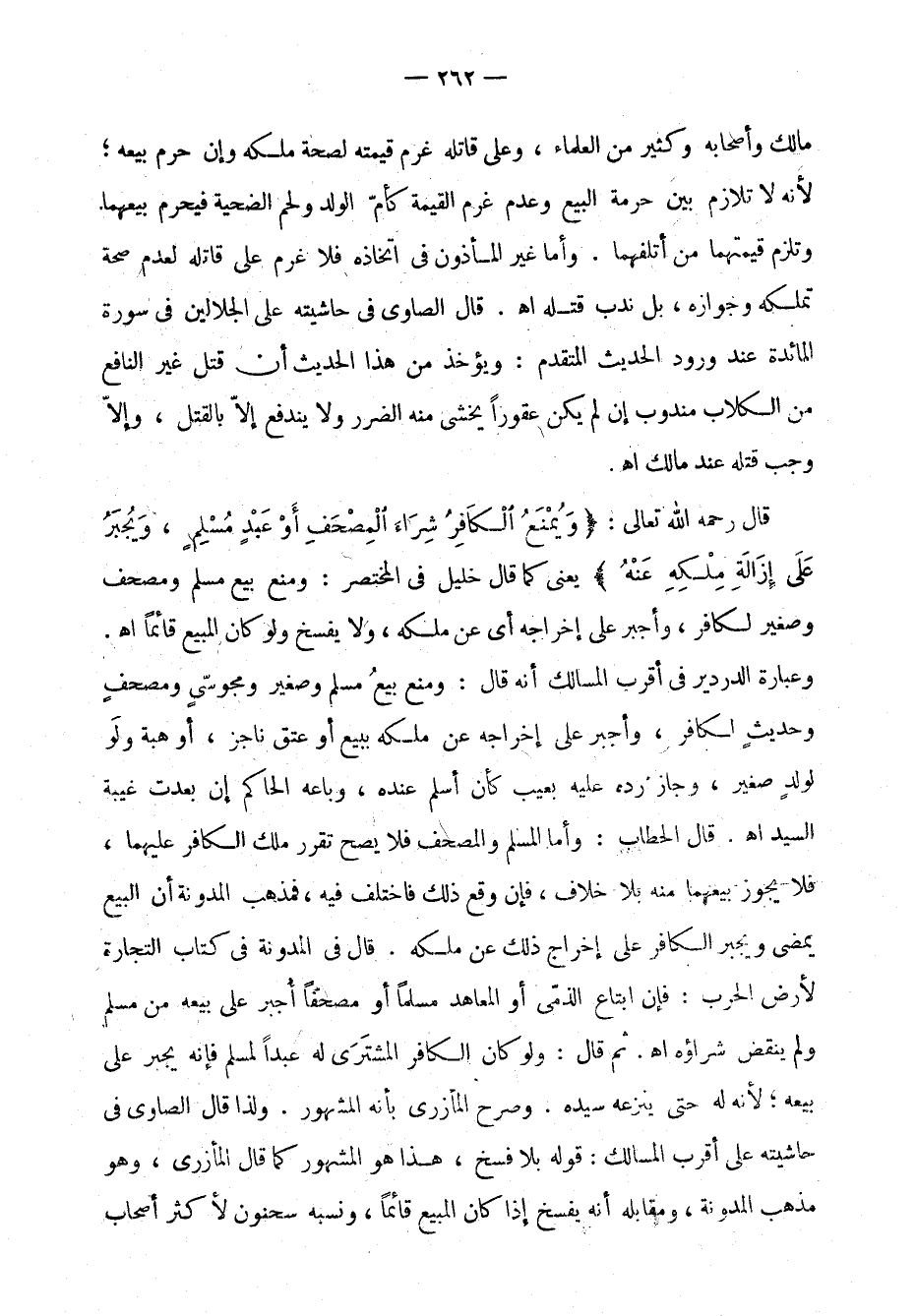 مالك وأصحابه وكثير من العلماء، وعلى قاتله غرم قيمته لصحة ملكه وإن حرم بيعه؛ لأنه لا تلازم بين حرمة البيع وعدم غرم القيمة كأم الولد ولحم الضحية فيحرم بيعهما وتلزم قيمتهما من أتلفهما. وأما غير المأذون في اتخاذه فلا غرم على قاتله لعدم صحة تملكه وجوازه، بل ندب قتله اهـ. قال الصاوي في حاشيته على الجلالين في سورة المائدة عند ورد الحديث المتقدم: ويؤخذ من هذا الحديث أن قتل غير النافع من الكلاب مندوب إن لم يكن عقوراً يخشى منه الضرر ولا يندفع إلا بالقتل، وإلا وجب قتله عند مالك اهـ.