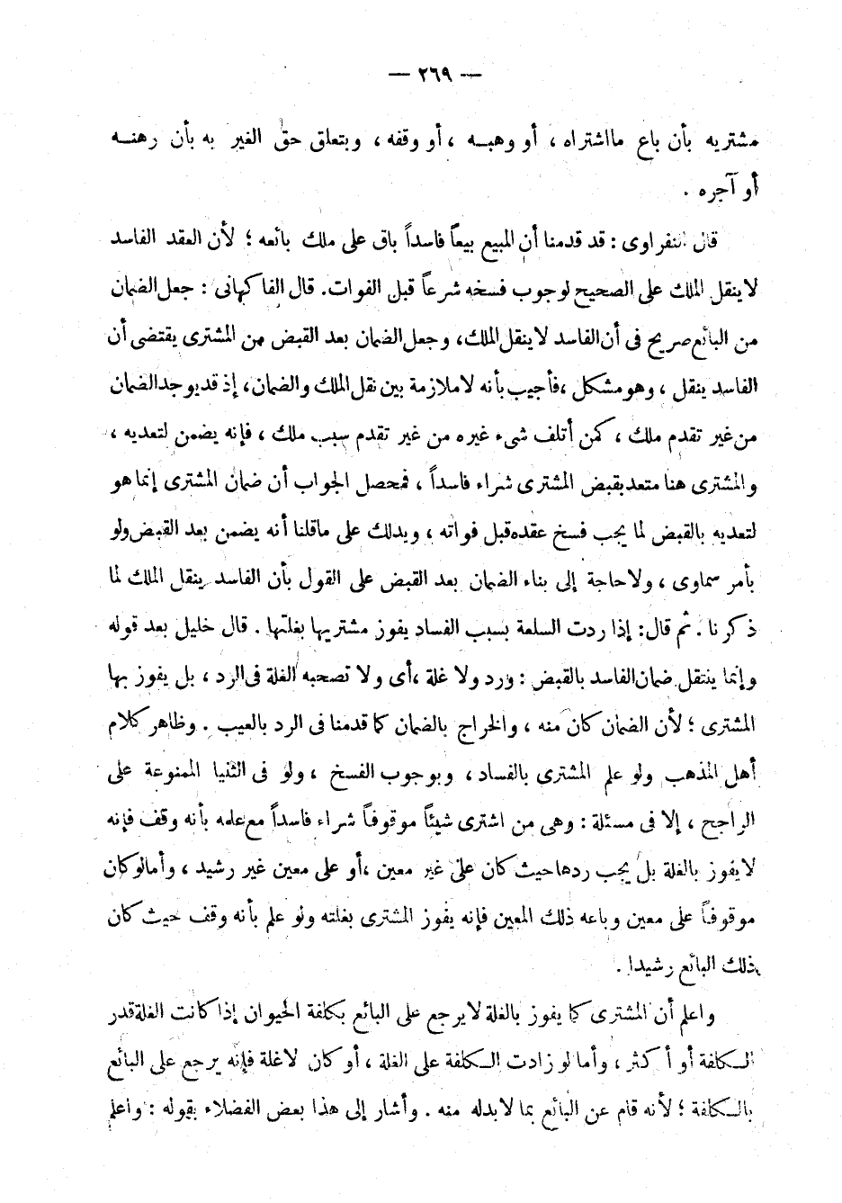 قال النفراوي: قد قدمنا أن المبيع بيعاً فاسداً باق على ملك بائعه؛ لأن العقد الفاسد لا ينقل الملك على الصحيح لوجوب فسخه شرعاً قبل الفوات. قال الفاكهاني: جعل الضمان من البائع صريحاً في أن الفاسد لا ينقل الملك، وجعل الضمان بعد القبض من المشتري يقتضي أن الفاسد ينقل، وهو مشكل، فأجيب بأنه لا ملازمة بين نقل الملك والضمان، إذ قد يوجد الضمان من غير تقدم ملك، كمن أتلف شيء غيره من غير تقدم سبب ملك، فإنه يضمن لتعديه، والمشتري هنا متعد بقبض المشتري شراء فاسداً، فمحصل الجواب أن ضمان المشتري إنما هو لتعديه بالقبض لما يجب فسخ عقده قبل فواته، ويدلك على ما قلنا أنه يضمن بعد القبض ولو بأمر سماوي، ولا حاجة إلى بناء الضمان بعد القبض على القول بأن الفاسد ينقل الملك لما ذكرنا. ثم قال: إذا ردت السلعة بسبب الفساد يفوز مشتريها بغلتها. قال خليل بعد قوله وإنما ينتقل ضمان الفاسد بالقبض: ورد ولا غلة، أي لا تصحبه الغلة في الرد، بل يفوز بها المشتري؛ لأن الضمان كان منه، والخراج بالضمان كما قدمنا في الرد بالعيب. وظاهر كلام أهل المذهب ولو علم المشتري بالفساد، وبوجوب الفسخ، ولو في الثنيا الممنوعة على الراجح، إلا في مسألة: وهي من اشترى شيئاً موقوفاً شراء فاسداً مع علمه بأنه وقف فإنه لا يفوز بالغلة بل يجب ردها حيث كان على غير معين، أو على معين غير رشيد، وأما لو كان موقوفاً على معين وباعه ذلك المعين فإنه يفوز المشتري بغلته ولو علم بأنه وقف حيث كان ذلك البائع رشيداً.