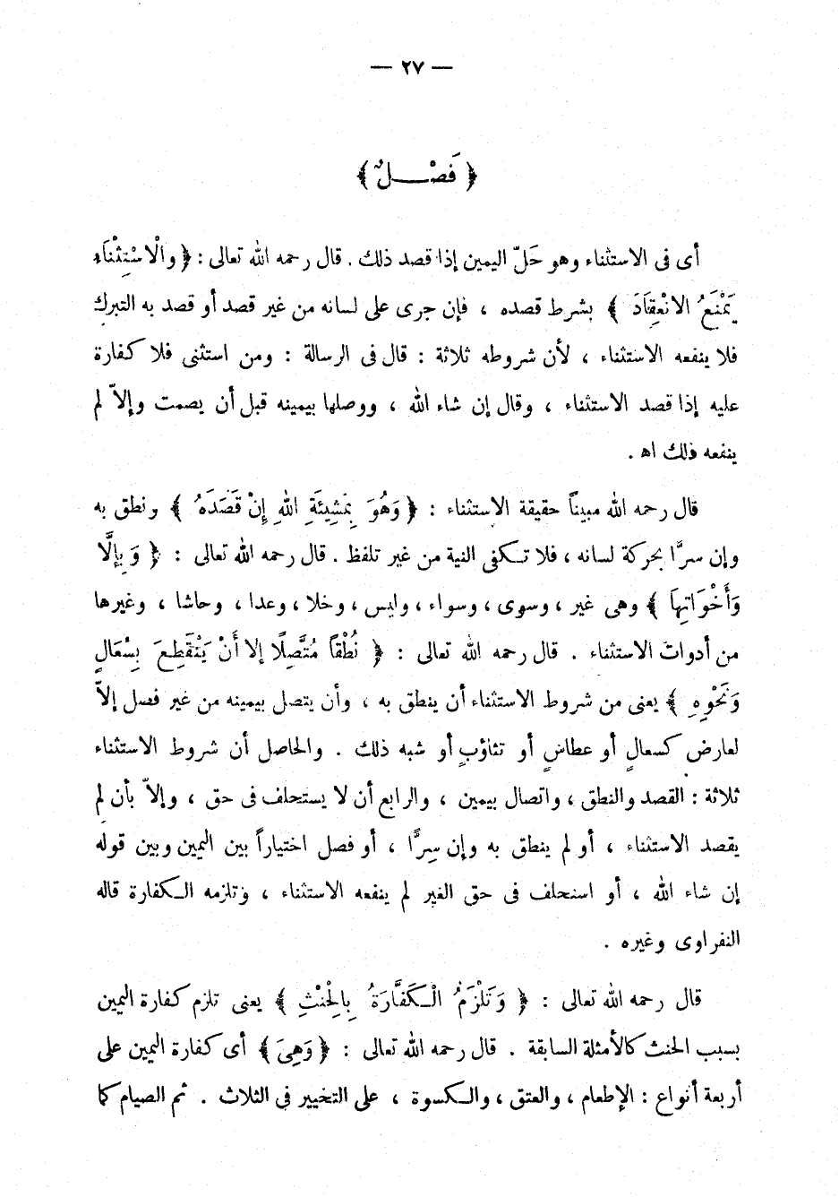قال رحمه الله مبيناً حقيقة الاستثناء: " وهو بمشيئة الله إن قصده " ونطق به وإن سراً بحركة لسانه، فلا تكفي النية من غير تلفظ. قال رحمه الله تعالى: " وبإلا وأخواتها " وهي غير، وسوى، وليس، وخلا، وعدا، وحاشا، وغيرها من أدوات الاستثناء. قال رحمه الله تعالى: " نطقاً متصلاً إلا أن ينقطع بسعال ونحوه " يعني من شروط الاستثناء أن ينطق به، وأن يتصل بيمينه من غير فصل إلا لعارض كسعال أو عطاس أو تثاؤب أو شبه ذلك. والحاصل أن شروط الاستثناء ثلاثة: القصد والنطق، واتصال بيمين، والرابع أن لا يستحلف في حق، وإلا بأن لم يقصد الاستثناء، أو لم ينطق به وإن سراً، أو فصل اختياراً بين اليمين وبين قوله إن شاء الله، أو استحلف في حق الغير لم ينفعه الاستثناء، وتلزمه الكفارة قال النفراوي وغيره.