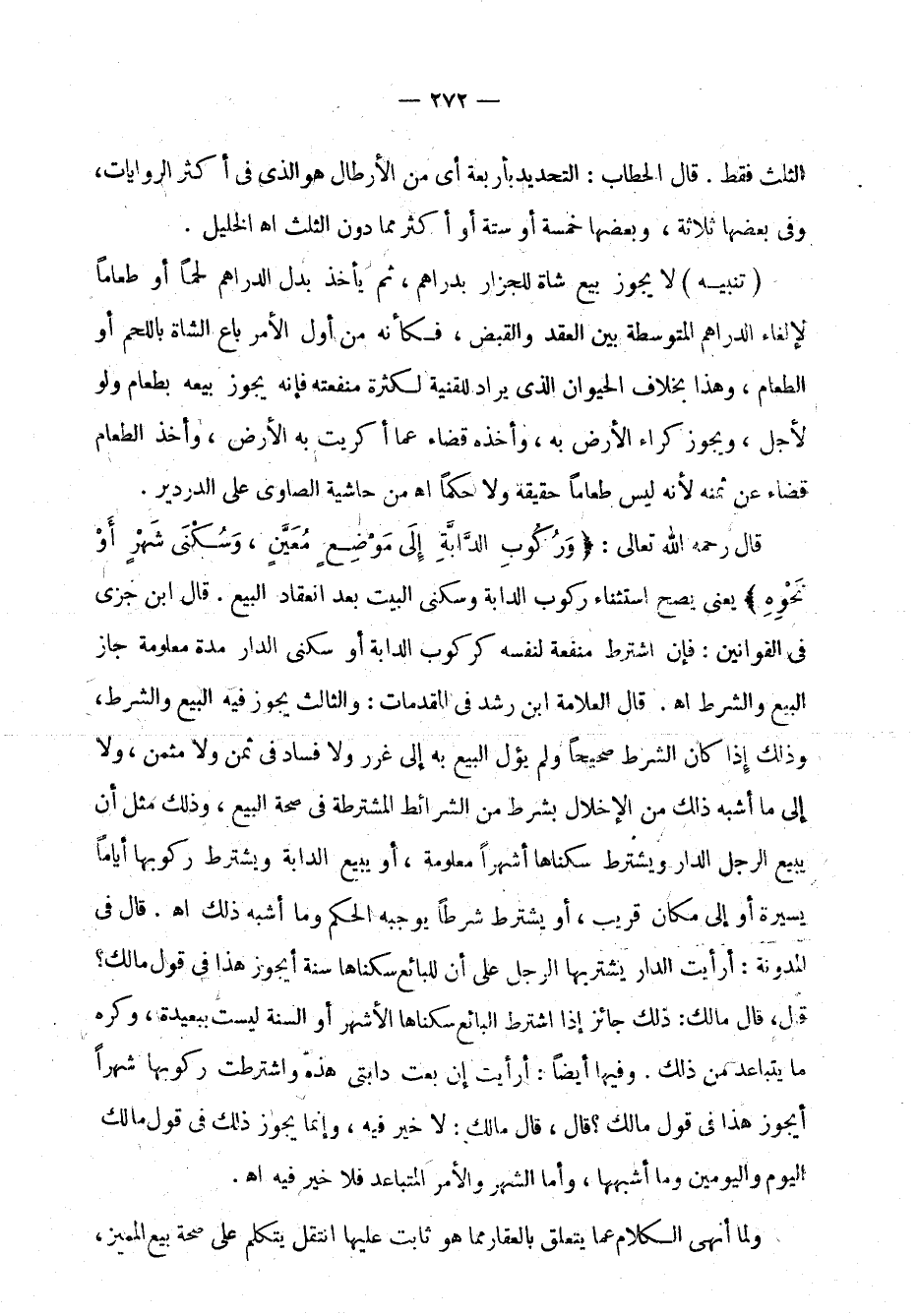 الرجل على أن للبائع سكناها سنة أيجوز هذا في قول مالك؟ قال: قال مالك: ذلك جائز إذا اشترط البائع سكناها الأشهر أو السنة ليست ببعيدة، وكره ما يتباعد من ذلك. وفيها أيضاً: أرأيت إن بعت دابتي هذه واشترطت ركوبها شهراً أيجوز هذا في قول مالك؟ قال: قال مالك: لا خير فيه، وإنما يجوز ذلك في قول مالك اليوم واليومين وما أشبهها، وأما الشهر والأمر المتباعد فلا خير فيه اهـ.
