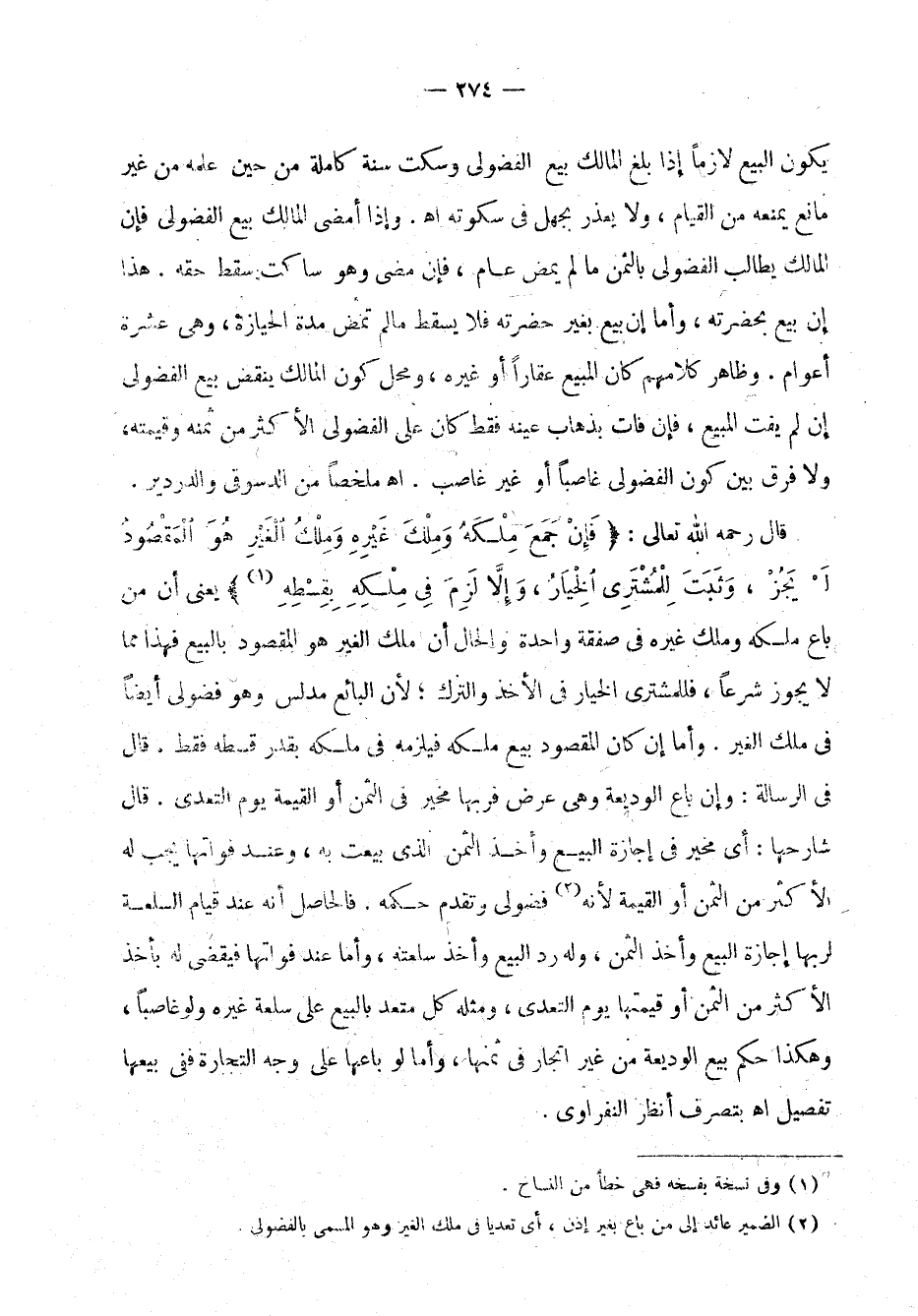 حضرته فلا يسقط ما لم تمض مدة الحيازة، وهي عشرة أعوام. وظاهر كلامهم كان المبيع عقاراً أو غيره، ومحل كون المالك ينقض بيع الفضولي إن لم يفت المبيع، فإن فات بذهاب عينه فقط كان على الفضولي الأكثر من ثمنه وقيمته، ولا فرق بين كون الفضولي غاضباً أو غير غاضب. اهـ. ملخصاً من الدسوقي والدردير.