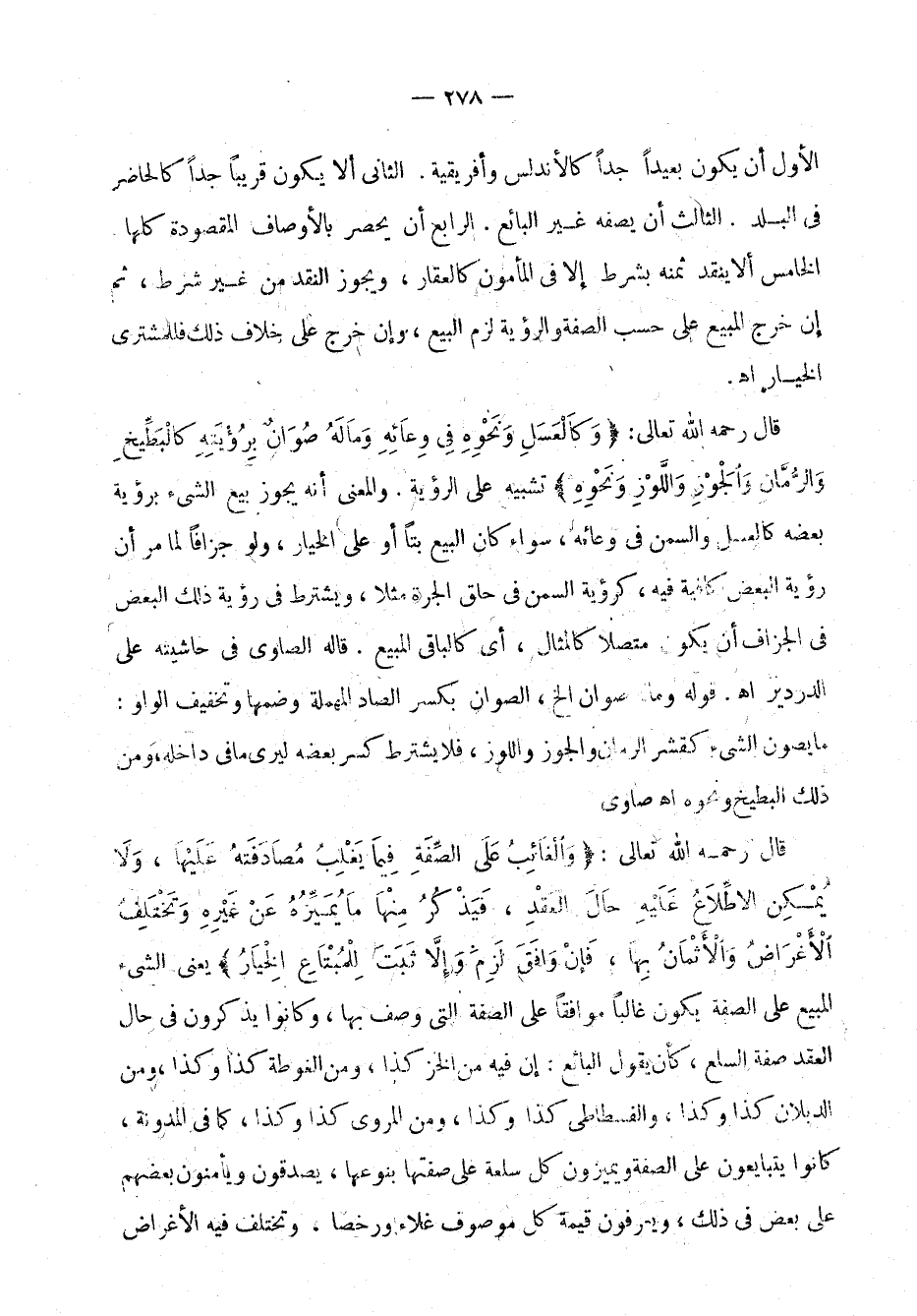 الأول: أن يكون بعيداً جداً كالأندلس وأفريقية. الثاني: ألا يكون قريباً جداً كالحاضر في البلد. الثالث: أن يصفه غير البائع. الرابع: أن يحضر بالأوصاف المقصودة كلها. الخامس: ألا ينقد ثمنه بشرط إلا في المأمون كالعقار، ويجوز النقد من غير شرط، ثم إن خرج المبيع على حسب الصفة والرؤية لزم البيع، وإن خرج على خلاف ذلك فللمشتري الخيار اهـ.