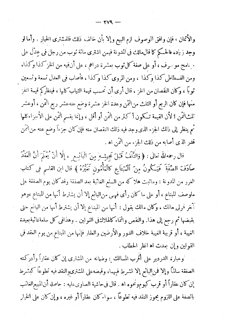 والأثمان، فإن وافق الموصوف لزم البيع وإلا بأن خالف ذلك فللمشتري الخيار. وأم لو وجد زيادة فالحكم كما قال مالك في المدونة فيمن اشترى مائة ثوب من رجل في عدل على برنامج موصوف، أو على صفة كل ثوب بعشرة دراهم، على أن فيه من الخز كذا وكذا، ومن الفسطاطي كذا وكذا، ومن المروى كذا وكذا، فأصاب في العدل تسعة وتسعين ثوباً، وكان النقصان من الخز، قال أرى أن تحسب قيمة الثياب كلها، فينظر كم قيمة الخز منها فإن كان الربع أو الثلث من الثمن وعدة الخز عشرة وضع عنه عشر ربع الثمن، أو عشر ثلث الثمن؛ لأن القيمة تكون أكثر من الثمن أو أقل، وإنما يقسم الثمن على الأجزاء كلها ثم ينظر إلى ذلك الجزء الذي وجد فيه ذلك النقصان منه فإن كان جزءاً وضع عنه من الثمن قدر الذي أصابه من ذلك الجزء من الثمن اهـ.