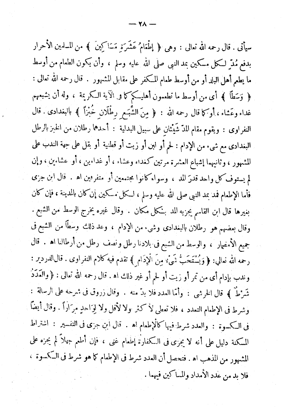 سيأتي. قال رحمه الله تعالى: وهي " إطعام عشرة مساكين " من المسلمين الأحرار بدفع مد لكل مسكين بمد النبي صلى الله عليه وسلم، وأن يكون الطعام من أوسط ما يطعم أهل البلد أو من أوسط طعام المكفر على مقابل المشهور. قال رحمه الله تعالى: " وسطاً " أي من أوسط ما تطعمون أهليكم كما في الآية الكريمة، وله أن يشبعهم غداء وعشاء، أو كما قال رحمه الله: " من الشبع رطلان خبزاً " بالبغدادي. قال النفراوي: ويقوم مقام المد شيئان على سبيل البدلية: أحدهما رطلان من الخبز بالرطل البغدادي مع شيء من الإدام: لحم أو لبن أو زيت أو قطنية أو بقل على جهة الندب على المشهور، وثانيهما إشباع العشرة مرتين كغداء وعشاء، أو