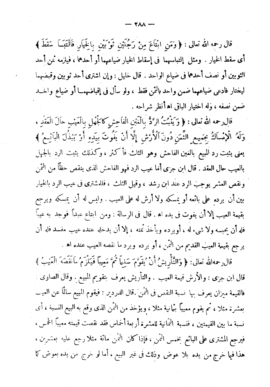 قال رحمه الله تعالى: " ومن ابتاع من رجلين ثوبين بالخيار فالتبسا سقط " أي سقط الخيار. ومثل التباسهما في إسقاط الخيار ضياعهما أو أحدهما، فيلزمه ثمن أحد الثوبين أو نصف أحدهما في ضياع الواحد. قال خليل: وإن اشترى أحد