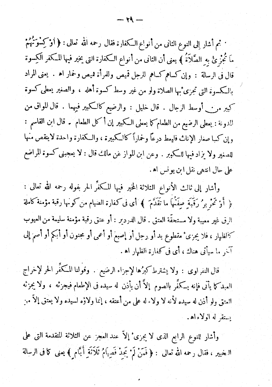 ثم أشار إلى النوع الثاني من أنواع كفارة فقال رحمه الله تعالى: " أو كسوتهم ما تجزئ به الصلاة " يعني أن الثاني من أنواع الكفارة التي يخير فيها المكفر الكسوة قال في الرسالة: وإن كساهم كساهم للرجل قميص وللمرأة قميص وخمار اهـ. يعني المراد بالكسوة التي تجزئ بها الصلاة ولو من غير وسط كسوة أهله، والصغير يعطى كسوة كبير من أوسط الرجال. قال خليل: والرضيع كالكبير فيهما. قال المواق من المدونة: يعطى الرضيع من الطعام كما يعطى الكبير إن أكل الطعام. قال ابن القاسم: وإن كسا صغار الإناث فليعط درعاً وخماراً كالكبيرة، والكفارة واحدة لا ينقص منها للصغير ولا يزداد فيها للكبير. وعن ابن المواز عن مالك قال: لا يعجبني كسوة المراضع على حال انتهى نقل ابن يونس اهـ.