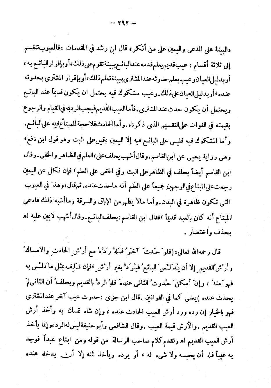 (البينة على من المدعي واليمين على من أنكر) قال ابن رشد في المقدمات: فالعيوب تنقسم إلى ثلاثة أقسام: عيب قديم يعلم قدمه عند البائع ببينة تقوم على ذلك، أو بإقرار البائع به، أو بدليل العيان وعيب يعلم حدوثه عند المشتري ببينة تعلم ذلك، أو بإقرار المشتري بحدوثه عنده، أو بدليل العيان على ذلك. وعيب مشكوك فيه يحتمل أن يكون قديماً عند البائع ويحتمل أن يكون حدث عند المشتري. فأما العيب القديم فيجب الرد به في