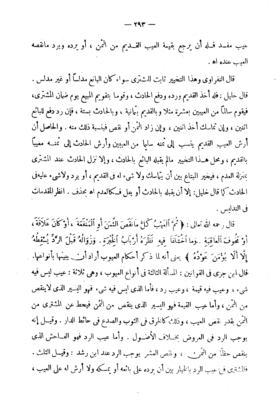 قال النفراوي وهذا التخيير ثابت للمشتري سواء كان البائع مدلساً أو غير مدلس. قال خليل: فله أخذ القديم ورده ودفع الحادث، وقوَّما بتقويم المبيع يوم ضمان المشتري، فيقوم سالماً من العيبين بعشرة مثلاً وبالقديم بثمانية، وبالحادث بستة، فإن رد دفع للبائع اثنين، وإن تماسك أخذ اثنين، وإن زاد الثمن أو نقص فبنسبة ذلك منه. والحاصل أن أرش العيب القديم ينسب إلى ثمنه سليماً من العيبين وأرش الحادث إلى ثمنه معيباً بالقديم، ومحل هذا التخيير ما لم يقبله بالحادث، وإلا نزل الحادث عند المشتري بمنزلة العدم، فيخير المبتاع بين أن يتماسك ولا شيء له في القديم، أو يرد ولا شيء عليه في الحادث كما قال خليل: إلا أن يقبله بالحادث أو يقل فكالعدم اهـ بحذف. انظر المقدمات في التدليس.