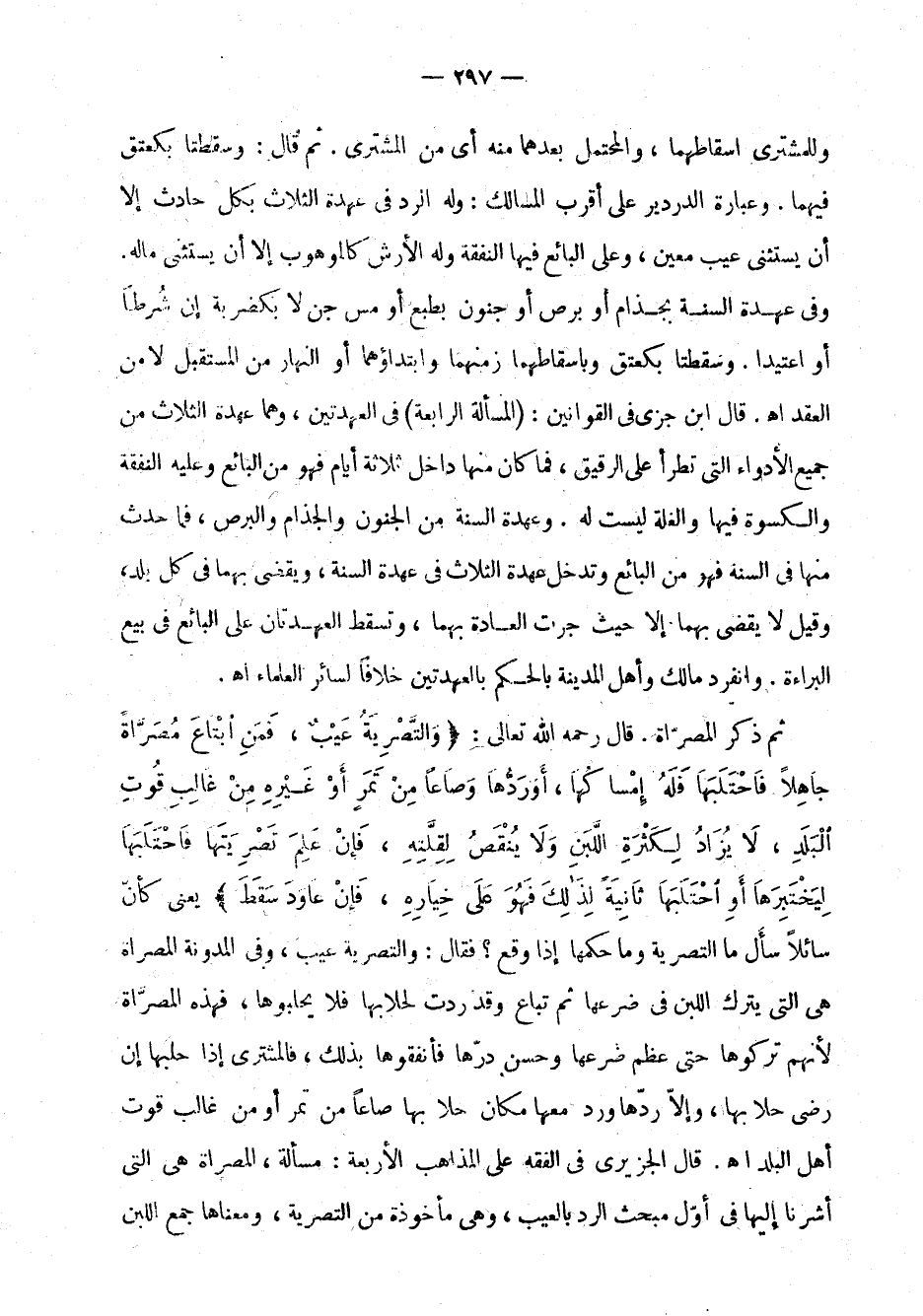 احتلبها ثانية لذلك فهو على خياره، فإن عاود سقط " يعني كأن سائلاً سأل ما التصرية وما حكمها إذا وقع؟ فقال: والتصرية عيب، وفي المدونة المصراة هي التي يترك اللبن في ضرعها ثم تباع وقد ردت لحلابها فلا يحلبوها، فهذه المصراة لأنهم تركوها حتى عظم ضرعها وحسن درها فأنفقوها بذلك، فالمشتري إذا حلبها إن رضي حلابها، وإلا ردها ورد معها مكان حلابها صاعاً من تمر أو من غالب قوت أهل البلد اهـ. قال الجزيري في الفقه على المذاهب الأربعة: مسألة المصراة هي التي أشرنا إليها في أول مبحث الرد بالعيب، وهي مأخوذة من التصرية، ومعناها جمع اللبن
