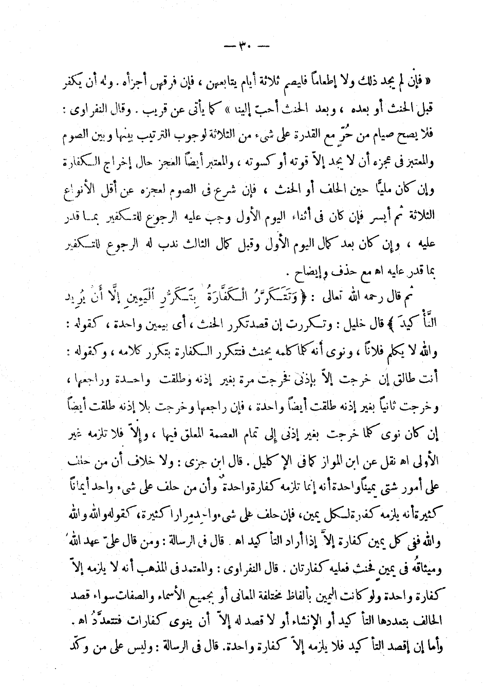 قال خليل: وتكررت إن قصد تكرر الحنث، أي بيمين واحدة، كقوله: والله لا يكلم فلاناً، ونوى أنه كلما كلمه يحنث فتتكرر الكفارة بتكرر كلامه، وكقوله: أنت طالق إن خردت إلا بإذني فخرجت مرة بغير إذنه وطلقت واحدة وراجعها، وخرجت ثانياً بغير إذنه طلقت أيضاً واحدة، فإن راجعها وخرجت بلا إذنه طلقت أيضاً إن كان نوى كلما خرجت بغير إذنه إلى تمام العصمة المعلق فيها، وإلا فلا تلزمه غير الأولى اهـ نقل عن ابن المواز كما في الإكليل. قال ابن جزي: ولا خلاف أن من حلف على أمور شتى يميناً واحدة أنه يلزمه كفارة واحدة وأن من حلف على شيء واحد أيماناً كثيرة أنه يلزمه كفارة لكل يمين، فإن حلف على شيء واحد مراراً كثيرة، كقوله والله والله والله ففي كل يمين كفارة إلا إذا أراد التأكيد اهـ. قال في الرسالة: ومن قال علي عهد الله وميثلقه في يمين فحنث فعليه كفارتان. قال النفراوي: والمعتمد في المذهب أنه لا يلزمه إلا كفارة واحدة ولو كانت اليمين بألفاظ مختلفة المعاني أو بجميع الأسماء والصفات سواء قصد الحالف بتعددها التأكيد أو الإنشاء أو لا قصد له إلا أن ينوى كفارات فتتعدد اهـ. وأما إن قصد التأكيد فلا يلزمه إلا كفارة واحدة. قال في الرسالة: وليس على من وكد