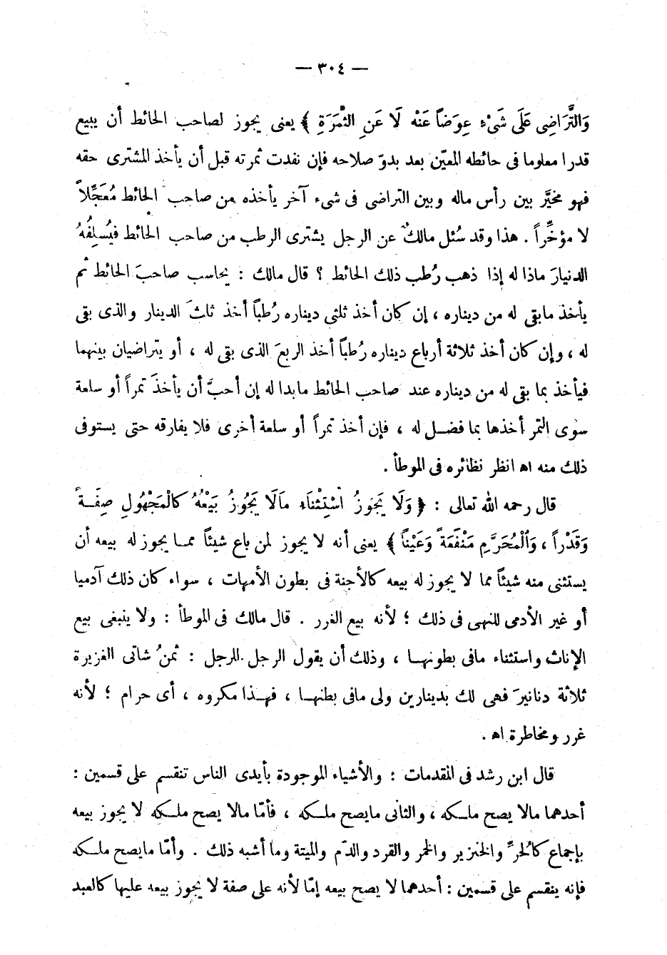 والتراضي على شيء عوضاً عنه لا عن الثمرة " يعني يجوز لصاحب الحائط أن يبيع قدراً معلوماً من حائطه المعين بعد بدو صلاحه، فإن نفدت ثمرته قبل أن يأخذ المشتري حقه فهو مخير بين رأس ماله وبين التراضي في شيء آخر يأخذه من صاحب الحائط معجلاً لا مؤخراً. هذا وقد سئل مالك عن الرجل يشتري الرطب من صاحب الحائط فيسلفه الدينار ماذا له إذا ذهب رطب ذلك الحائط؟ قال مالك: يحاسب صاحب الحائط ثم يأخذ ما بقي له من ديناره، إن كان أخذ ثلثي ديناره رطباً أخذ ثلث الدينار والذي بقي له، وإن كان أخذ ثلاثة أرباع ديناره رطباً أخذ الربع الذي بقي له، أو يتراضيان بينهما فيأخذ بما بقي له من ديناره عند صاحب الحائط ما بدا له إن أحب أن يأخذ تمراً أو سلعة سوى التمر أخذها بما فضل له، فإن أخذ تمراً أو سلعة أخرى فلا يفارقه حتى يستوفي ذلك منه اهـ انظر نظائره في الموطأ.