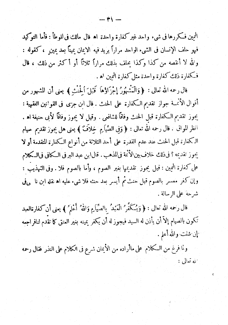 قال رحمه الله تعالى: " والمشهور إجزاؤها قبل الحنث " يعني أن المشهور من أقوال الأئمة جواز تقديم الكفارة على الحنث. قال ابن جزي في القوانين الفقهية: يجوز تقديم الكفارة قبل الحنث وفاقاً للشافعي. وقيل لا يجوز وفاقاً لأبي حنيفة اهـ. انظر المواق. قال رحمه الله تعالى: " وفي الصيام خلاف " يعني هل يجوز تقديم صيام الكفارة قبل الحنث عند عدم القدرة على أحد الثلاثة من أنواع الكفارة المتقدمة أو لا يجوز تقديمه؟ في ذلك خلاف بين الأئمة في المذهب. قال ابن عبد البر في الكافي في الكلام على كفارة اليمين: قيل يجوز تقديمها بغير الصوم، وأما بالصوم فلا. وفي التهذيب: وإن كفر معسر بالصوم قبل الحنث ثم أيسر بعد الحنث فلا شيء عليه اهـ نقله ابن ناجي في شرحه على الرسالة.